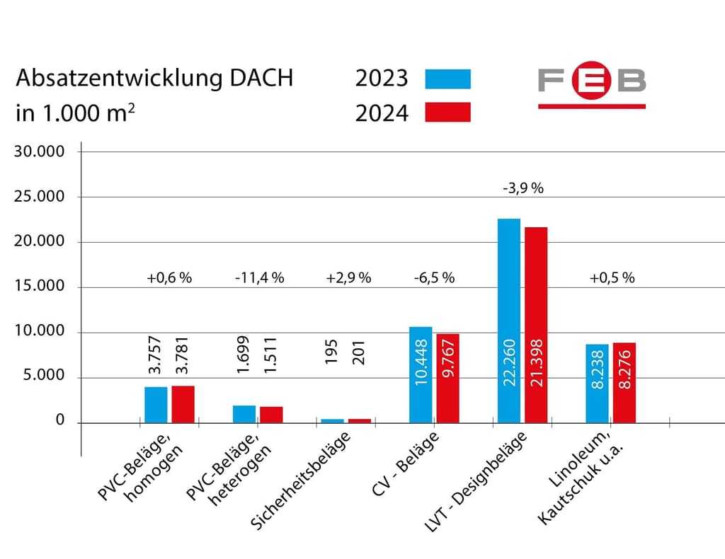 Der Fachverband der Hersteller elastischer Bodenbeläge (FEB) meldet für das Jahr 2024 einen Absatz von 44,9 Millionen Quadratmetern elastischer Bodenbeläge. Das entspricht einem Minus von 3,5 Prozent im Vergleich zum Vorjahr.