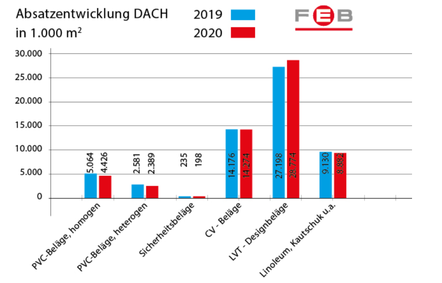 Der Absatz elastischer Bodenbeläge wächst in 2020 in der DACH -Region um 2,1 % oder um mehr als 1,1 Mio. Quadratmeter im Vergleich zum Vorjahr.