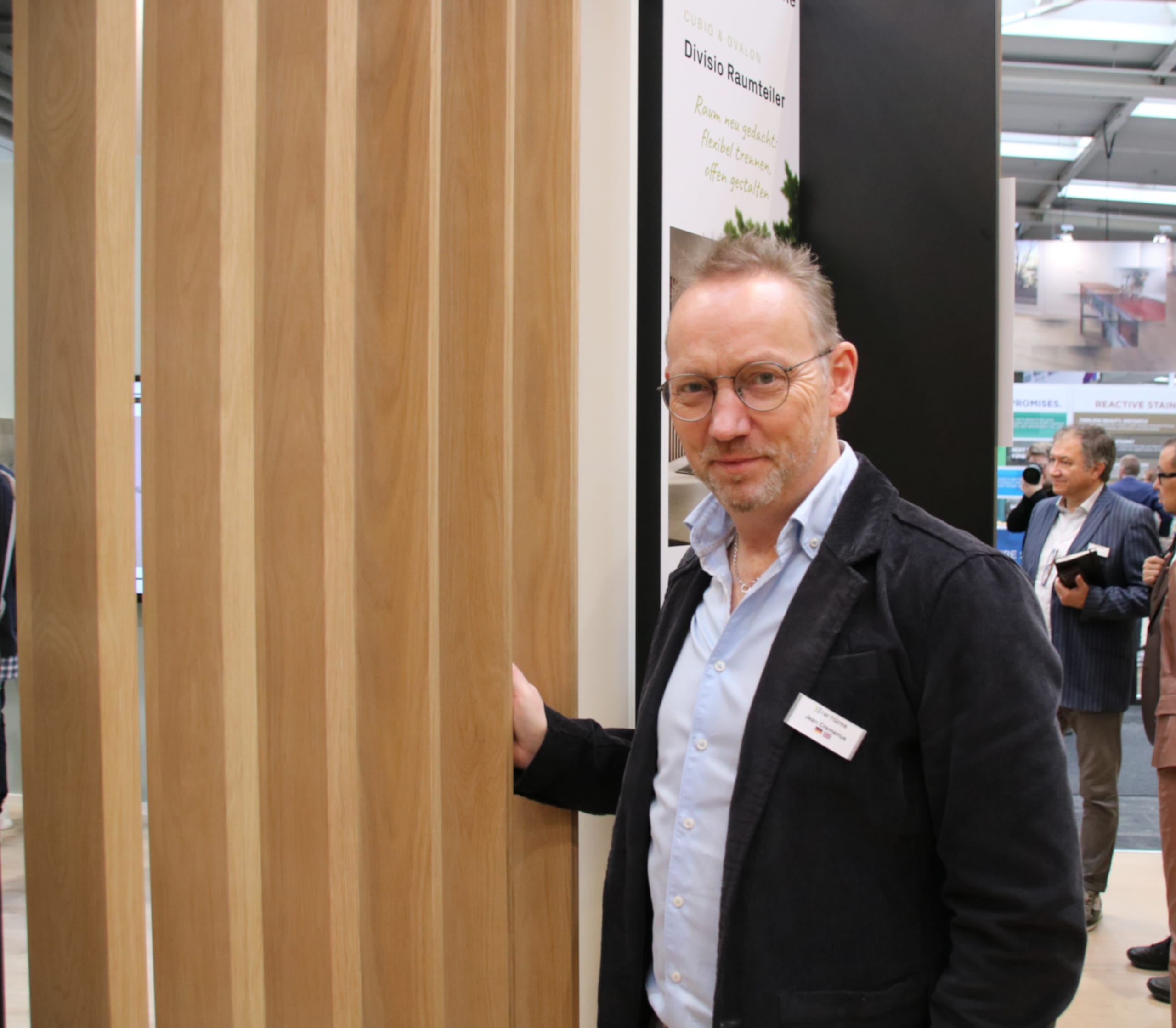 © RadziwillJulia Hofmann, Marketing und PR bei FN Neuhofer Holz, zeigte auf der Domotex zum Beispiel FN para-fix, einen Raumteiler, der aus drehbaren Lamellen besteht. Der Clou: Dreht man eine Lamelle, drehen sich die anderen synchron mit. -