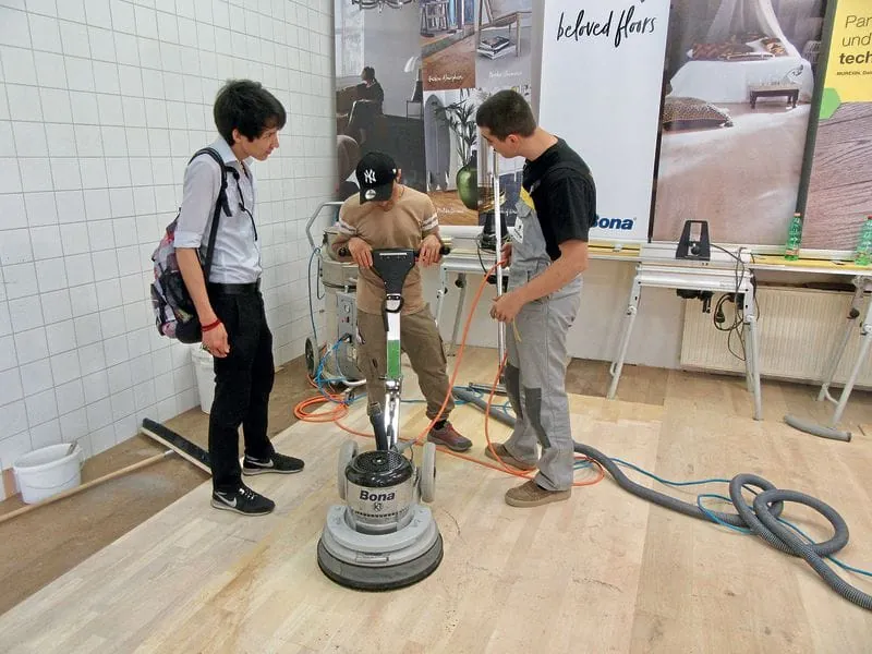 Jeder Interessierte bekam nicht nur von den fast gleichaltrigen Lehrlingen Einblicke in das Berufsbild und die Tätigkeiten der jeweiligen Gewerke, sondern durfte und sollte unter Aufsicht selbst Hand anlegen. Dabei lernten die Jugendlichen, dass die Bearbeitung eines Holzbodens mit einer Einscheibenmaschine nicht so einfach ist, wie es beim Zusehen wirkt. Können und eine ruhige Hand waren notwendig, damit die schwere Maschine nicht ausriss oder gar gegen die Wand fuhr. Die Einschebenmaschine war aber nur eine Station beim Handwerkspass, bei dem die jungen Leute ihr handwerkliches Geschick beweisen konnten: Wer alle acht Stationen absolvierte, bekam ein kleines Geschenk.