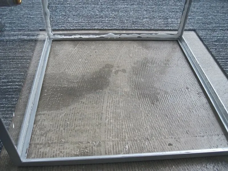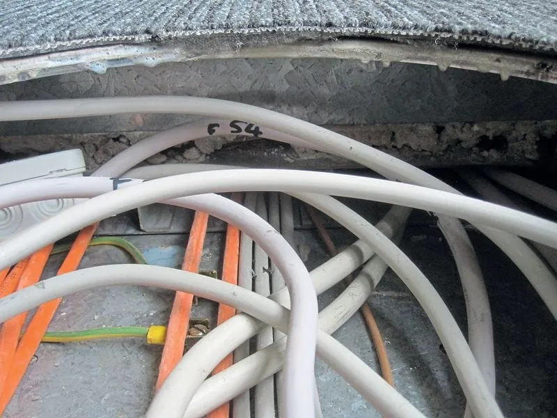 Der Sachverständige entfernte die wiederaufnehmbaren textilen Teppichfliesen ohne jegliche Beschädigung auf einer Teilfläche in der Größe der Frischluftkammer, sodass der gespachtelte Untergrund zu erkennen war. Offensichtlich wurde der alte Klebstoff nicht ausreichend abgeschliffen, denn es war deutlich zu sehen, dass die Riefen der ehemalig verwendeten Klebstoffzahnung nur leicht überspachtelt worden waren. Die Spachtelmasse wies zudem dunkle Verfleckungen auf, die an der Oberfläche leicht ölhaltig schimmerten. Um nun festzustellen, ob der störende Geruch von der Spachtelung beziehungsweise vom Unterbodenaufbau ausging, setzte der Gutachter die Frischluftkammer nochmals auf, durchspülte diese abermals mit Frischluft und sperrte den Luftraum ab. Bereits nach 20 Minuten lag das Ergebnis vor. Bei der Beurteilung zeigte sich, dass ein extrem süßlich beißender Geruch wahrnehmbar war. Der Verdacht lag daher nahe, dass die Ausdünstung durch den alten Klebstoff verursacht wurde. Um sich endgültig Gewissheit zu verschaffen, öffnete der Sachverständige zur Kontrolle noch vor Ort einen Elektranten (Vorrichtung zur Entnahme elektrischer Energie), um den darunter befindlichen Hohlboden ebenfalls zu prüfen. Bei dieser Prüfung des Hohlbodens konnte jedoch kein störender Geruch festgestellt werden.