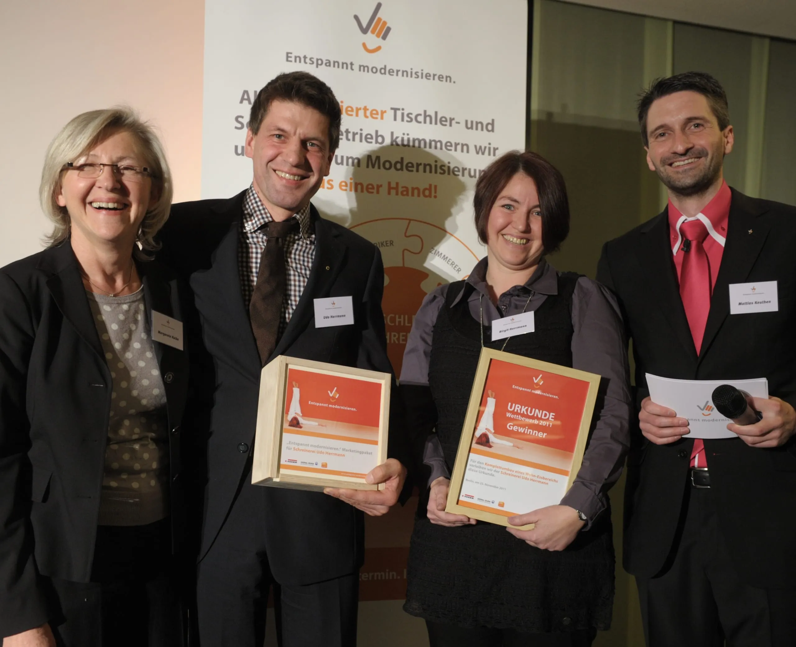 Die besten Modernisierungsprojekte Deutschlands wurden am 25. November 2011 in Berlin auf die große Bühne geholt. Die Jury kürte aus allen Einreichungen der Qualitätsgemeinschaft "Entspannt modernisieren" die Schreinerei Udo Herrmann aus Bürgstadt am Main mit der Verwandlung eines in die Jahre gekommenen Wohn-Essbereiches in ein modernes Wohlfühlambiente zum Gewinner.