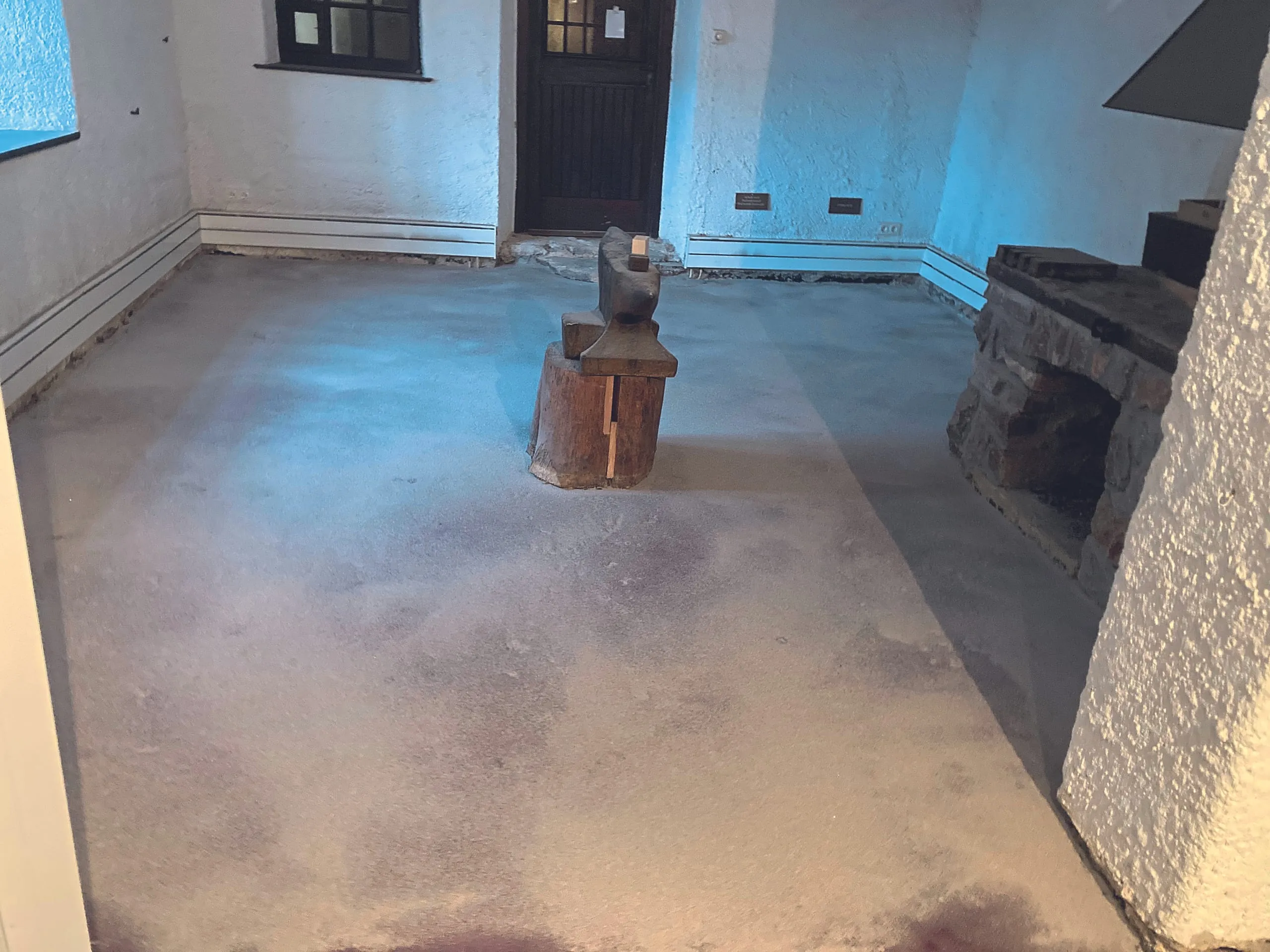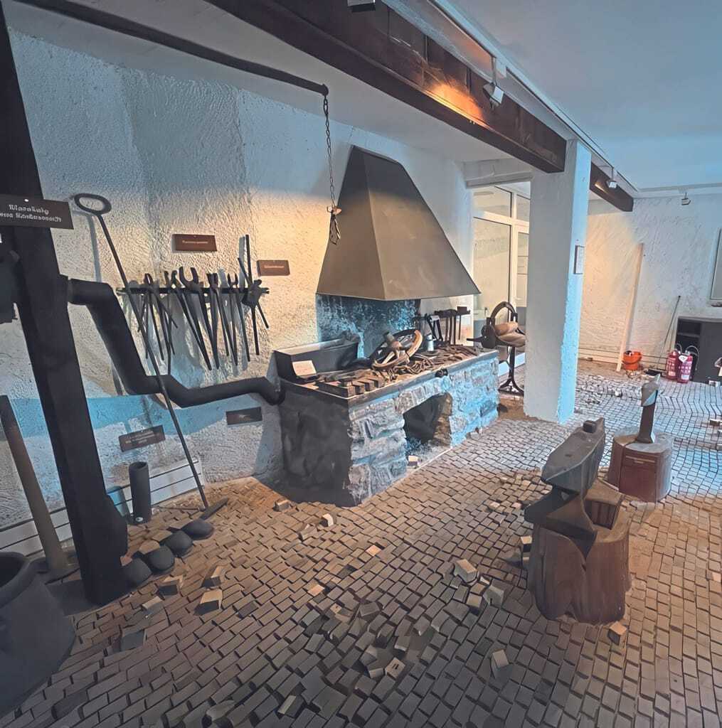 Da es sich bei dem Museum mit Schmiede um ein nur am Wochenende genutztes Objekt handelt, das nur sporadisch beheizt wird, galt es zunächst, die Holzfeuchte am vorhandenen Holzpflaster zu ermitteln. Die Messungen ergaben eine Holzfeuchte von 15 Prozent. In Folge dessen wurde das neue Holzpflaster auch mit derselben Holzfeuchte hergestellt. Nachdem die Restauratoren das alte Holzpflaster entfernt hatten, zeigte sich, dass sich der Unterboden der Schmiede in einem nicht akzeptablen Zustand befand. Um einen verlegereifen Unterboden zu erhalten, haben die Restauratoren den Fußboden zweimal mit Epoxidharz abgerollt und mit Quarzsand versehen.