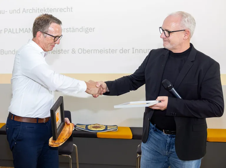 Bundesinnungsmeister Manfred Weber (rechts) überreicht Klaus Stolzenberger den Baumann-Fröhlich-Preis. - © Pallmann
