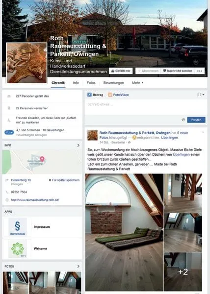 Konkret teilt sich das Facebook-Engagement in zwei Teile: Einerseits postet der Raumausstattungs- und Parkettbetrieb Bilder als Arbeitsbericht von der Baustelle, andererseits werden auch fertiggestellte Objekte veröffentlicht. „Normalerweise mache ich Bilder vor, während sowie nach der Baustelle, setze mich dann zum Posten daheim aufs Sofa und überlege mir zudem einen pfiffigen Text, der die User neugierig macht“, sagt Erika Roth, „manchmal ändere ich aber auch das Cover- und Profilbild. Das wird dann je nach Jahreszeit angepasst und mit passenden Produkten versehen.“ Im Frühjahr ist dann auf der Facebook-Seite als Profilfoto beispielsweise eine Markise zu sehen, im Sommer ein Insektenschutzgitter und im Winter eine Sofadecke. Das System hat Erfolg: Im Schnitt bekommen Beiträge der Owingerin fünf bis 30 Likes und werden ein- bis zweimal geteilt. „Der größte Erfolg war bisher ein Beitrag über einen neuen Tafelboden für den Neubau eines Gebäudes für das sogenannte ‚Apfelzügle‘. Dessen regionale Bekanntheit ermöglichte eine Reichweite von knapp 2.000 und sorgte dafür, dass der Beitrag zehnmal geteilt wurde. Wichtig ist es dabei immer, die Leute zum Teilen zu animieren – in Facebook muss man aktiv auf die Menschen zugehen“, betont Roth, die sich ihr Medienwissen über ihren Privat-Account angeeignet hat: „Für mich war das ‚Learning by Doing‘. Viele Ideen habe ich mir bei anderen Gewerken abgeschaut, die beim Einsatz neuer Medien schneller waren als Raumausstatter und Parkettleger“, erinnert sich die Frau des Geschäftsführers Norbert Roth, „wir als Handwerker machen so viele schöne Dinge, die Welt sollte das auch sehen.“
