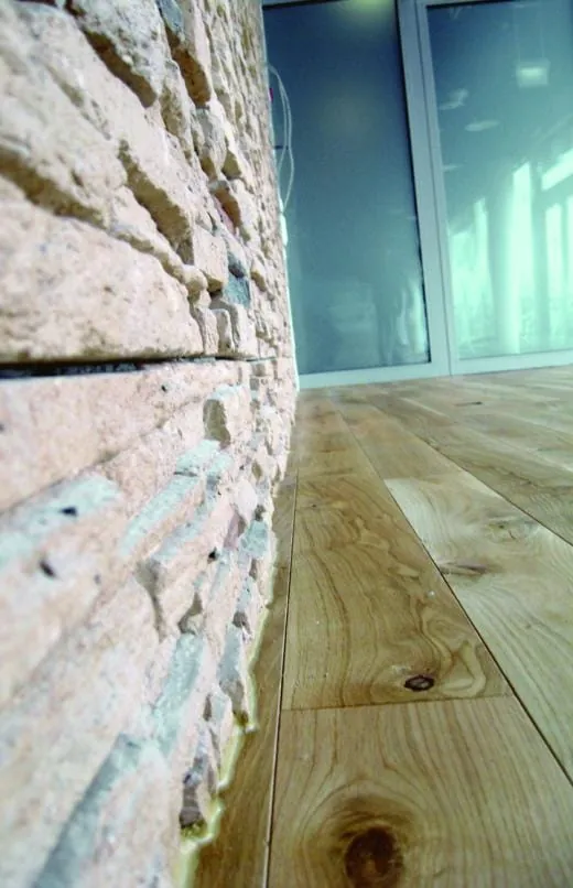 Die Dämm- und Renovierplatte besitzt trittschall- und wärmedämmende Eigenschaften. Zudem konnte ein druckfester Belagverbund geschaffen werden, der auftretende Zugspannungen zwischen Belag und Untergrund abbauen soll. Nach einer Trocknungszeit über Nacht wurde dann das Parkett mit dem schubfesten Klebstoff MK 95 verlegt. Durch die besondere Eigenschaft des Klebers, rasch auszuhärten, ließen sich die Parkettflächen bereits nach 24 Stunden schleifen. Da er hartelastisch aushärtet, verankert er die Parkettelemente dauerhaft fest mit dem Untergrund und begrenzt eventuell auftretende Verformungen des Holzes. Zudem mussten saubere Übergänge geschaffen werden, wie an einer zerklüfteten Steinwand, Treppen, Podesten sowie Heizungsschächten.-