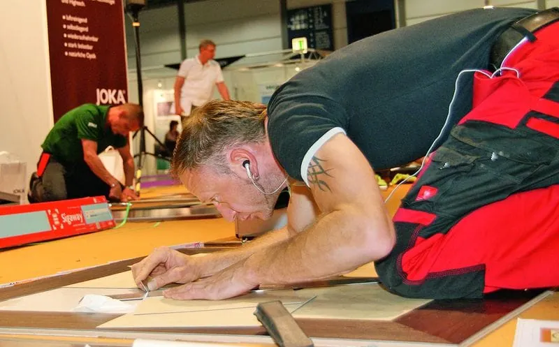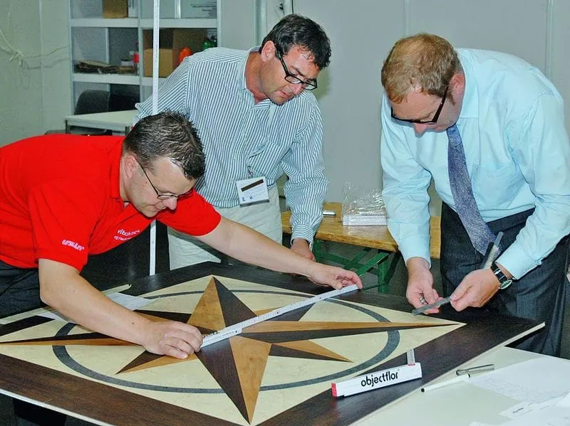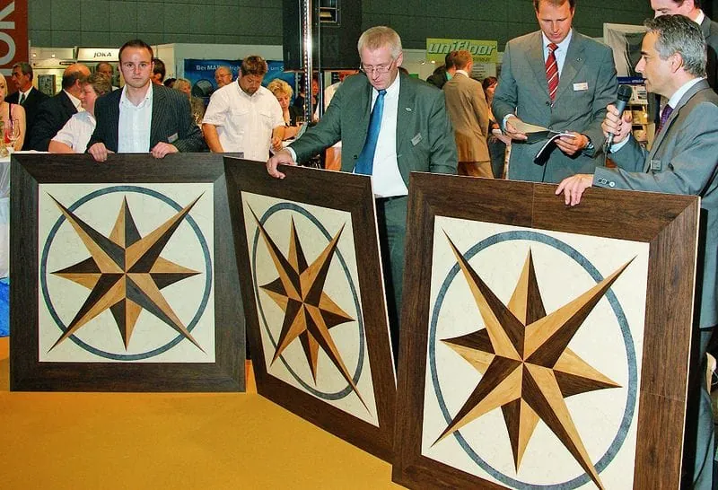 Unter den Augen staunender Comfortex-Besucher traten am 7. September elf bodenlegende Handwerker gegeneinander an. Die Aufgabe: Erstellen einer Intarsienarbeit auf einer Musterplatte in der Größe 1,20 × 1,20 Meter. Aus hellen und dunklen Planken und Fliesen der Joka-Design-Kollektion sollten die Teilnehmer einen Kompassstern fertigen. Besonders knifflig: Der drei Zentimeter breite Ring, in den der Stern einzubetten war. Richtzeit: vier Stunden. Da kamen selbst Routiniers ins Schwitzen.