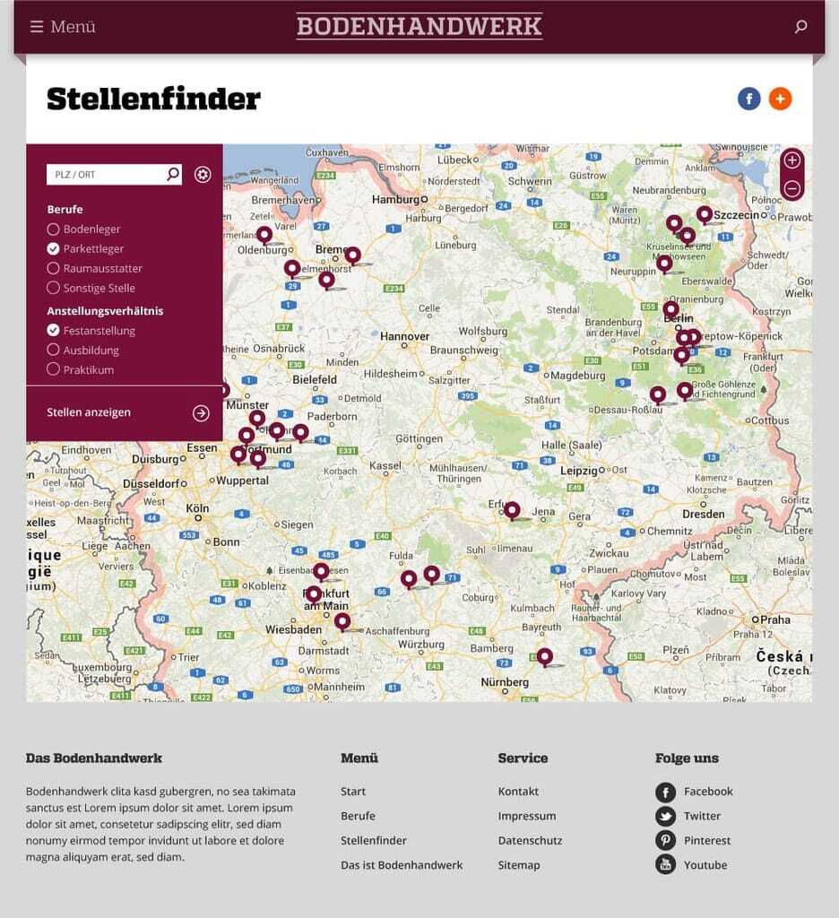 Auf der Internetseite www.das-ist-bodenhandwerk.de gibt es jetzt für Unternehmen der Branche die Möglichkeit Ausbildungsplätze, Praktikumsplätze und/oder Festanstellungen in den Bereichen Bodenleger/in, Parkettleger/in und Raumausstatter/in ohne Gebühren online auszuschreiben. Mitarbeitersuchende Handwerksbetriebe können hier genaue Stellenbeschreibungen machen, den geforderten Schulabschluss eintragen und ihre Kontaktdaten angeben. Sobald der Stellenfinder genügend Daten erhalten hat, damit das Stellenangebot online gehen kann, erhält der Nutzer eine Nachricht. Interessierte können sobald die Ausschreibung online ist, über einen Link direkt mit dem Unternehmen in Verbindung treten und sich bewerben. Die Suche kann eingeschränkt werden nach Postleitzahl, Art des Anstellungsverhältnisses und Beruf.