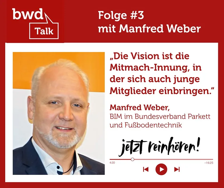 Manfred Weber ist Parkettlegermeister und Geschäftsführer eines Fußbodenverlegebetriebs in Bonn. Daneben amtiert er als Obermeister der Parkett- und Bodenlegerinnung Köln-Bonn-Aachen und als Bundesinnungsmeister im Bundesverband Parkett und Fußbodentechnik. In dieser Folge von bwd Talk zeigt Manfred Weber Wege auf, wie es gelingen kann, mit einem attraktiven Leistungsangebot vor allem den Nachwuchs im Handwerk für ein Innungs-Engagement zu gewinnen. Die Bundesinnung Parkett und Fußbodentechnik hat hierzu in jüngster Vergangenheit zahlreiche Initiativen angestoßen, die unter dem Leitmotiv „Die Mitmachinnung“ im Rahmen der Strategie „Innung 4.0“ erste Früchte tragen.