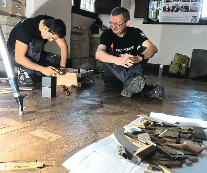 Beim 6. Workcamp Parquet, das im September im Schloss Groot-Bijgaarden in Belgien stattfand, waren auch Parkettrestaurator Martin Kranl und sein Bodenlegerlehrling Ali Janem mit von der Partie – und das bestimmt nicht zum ersten und letzten Mal.
