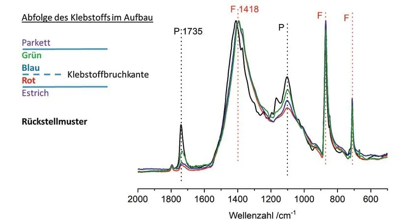 Ein weiterer wesentlicher Bestandteil war ein Füllstoff („F“), der anhand des IR-Spektrums sehr wahrscheinlich Calciumcarbonat (Kreide) darstellt. Der Vergleich aller IR-Spektren des enthafteten Klebstoffs, Klebstoff an der Estrichoberfläche (rot), Klebstoffbruchfläche an Parkett (blau), Klebstoff an Parkettrückseite (grün), mit dem des Rückstellmusters (schwarz) zeigt deutlich, dass der Anteil an Kreide in den untersuchten Klebstoffmustern nahezu gleichbleibt (unveränderte Signalhöhe von „F“), wohingegen die Signale des Bindemittelpolymers („P“), z. B. bei 1.735 cm-1, beim enthafteten Klebstoff am Parkettbzw. Estrich (rot, grün, blau) im Vergleich zum Referenzklebstoff deutlich abfallen . Dabei nimmt tendenziell der Anteil an Polymer ab, je näher am Estrichuntergrund gemessen wurde, der Anteil an Füllstoff bleibt hingegen konstant (siehe Tabelle).