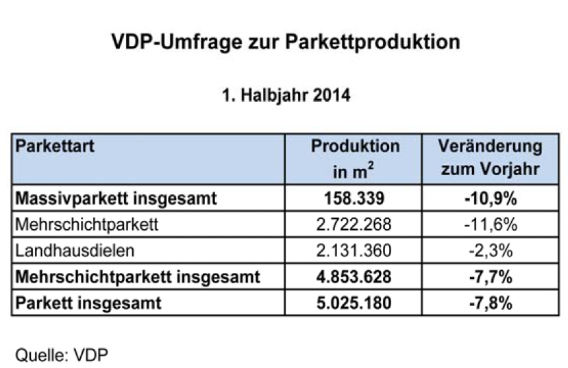 Auf rund fünf Milliarden Quadratmeter ist die hergestellte Menge an Parkett im ersten Halbjahr 2014 zurückgegangen. HDM und VDM beziehen sich mit dieser Nachricht auf eine interne Umfrage des Branchenverbandes vdp (Verband der Deutschen Parkettindustrie). Die einzelnen Segmente sollen sich dabei einheitlich ins Negative entwickelt haben: Während die Produktion von Massivparkett und klassischem Mehrschichtparkett um 10,9 beziehungsweise 11,6 Prozent zurückging, mussten die Hersteller von mehrschichtigen Landhausdielen einen leichten Produktionsrückgang von 2,3 Prozent verbuchen. Insgesamt sei die Produktion von Mehrschichtparkett insgesamt um rund 7,7 Prozent zurückgegangen.