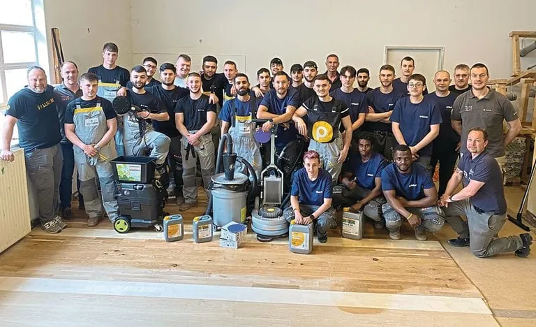 Die Profis erklärten das Schleifen und Bürsten anhand der Schleifmaschine Pallmann Spider und gaben Tipps zum Versiegeln und Ölen . Dabei durften die Auszubildenden auch selber Hand anlegen und die Anwendungsweise der Pallmann Spider auf der vorbereiteten Parkettfläche gleich ausprobieren. Zur abschließenden Oberflächenbehandlung zeigten die Anwendungstechniker den Einsatz von Farbe und Öl auf der Parkettfläche. Neben den praktischen Übungen gingen die Pallmann-Profis in einer Theorieeinheit auf die Unterschiede der Schleifmittel Zirkon , Keramik und Silicium Carbid ein.