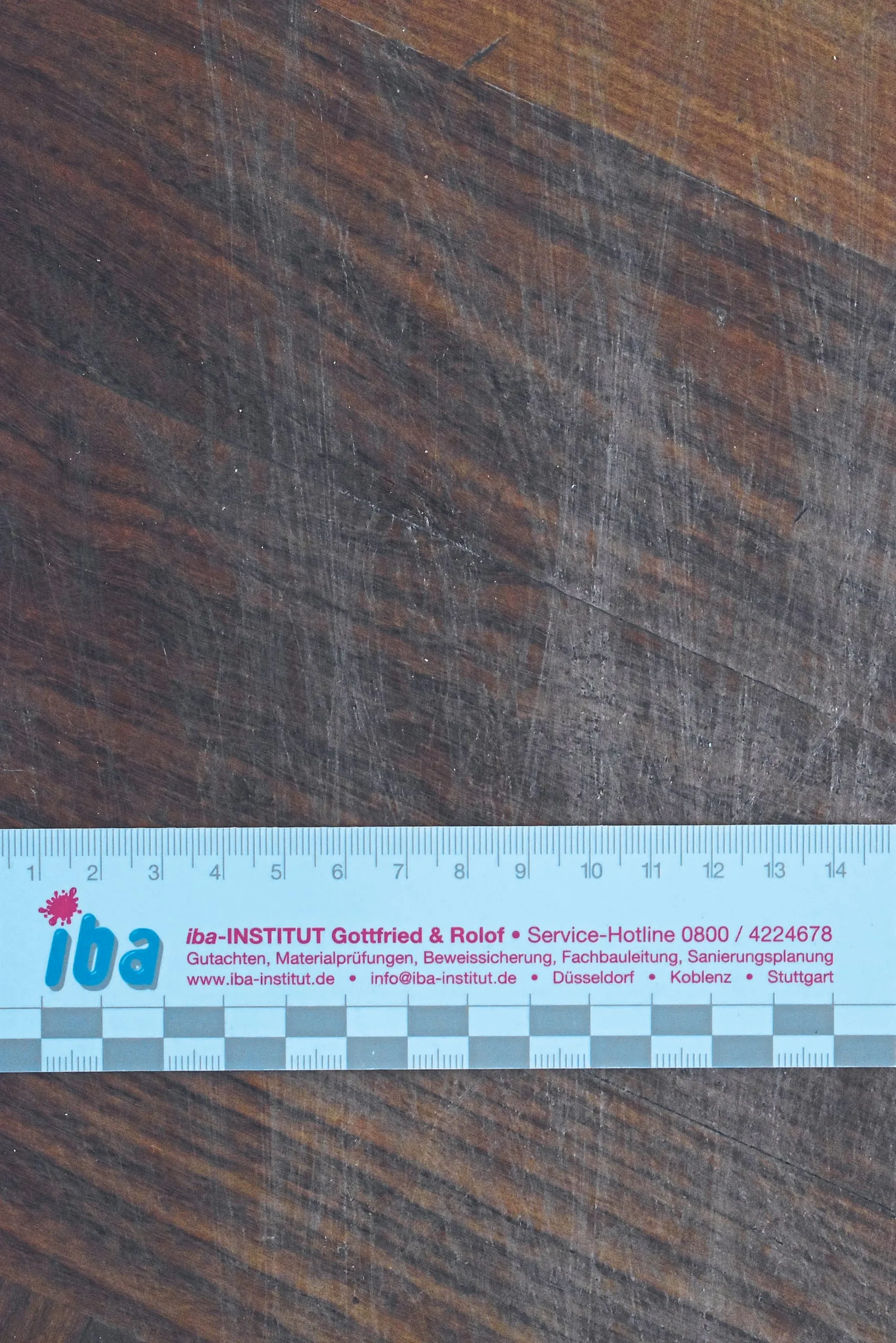 An gleicher Stelle wurde sodann ein Stuhl mit Vierfußgestell und den charakteristischen Fremdkörpereinschlüssen nach Aufsitzen auf den Stuhl wiederum mehrfach hin und her bewegt. Bereits nach kurzer Zeit zeigten sich augenscheinlich-visuell lineare Kratz und Schleifspuren als Weißbruch in der lackierten Parkettoberfläche.