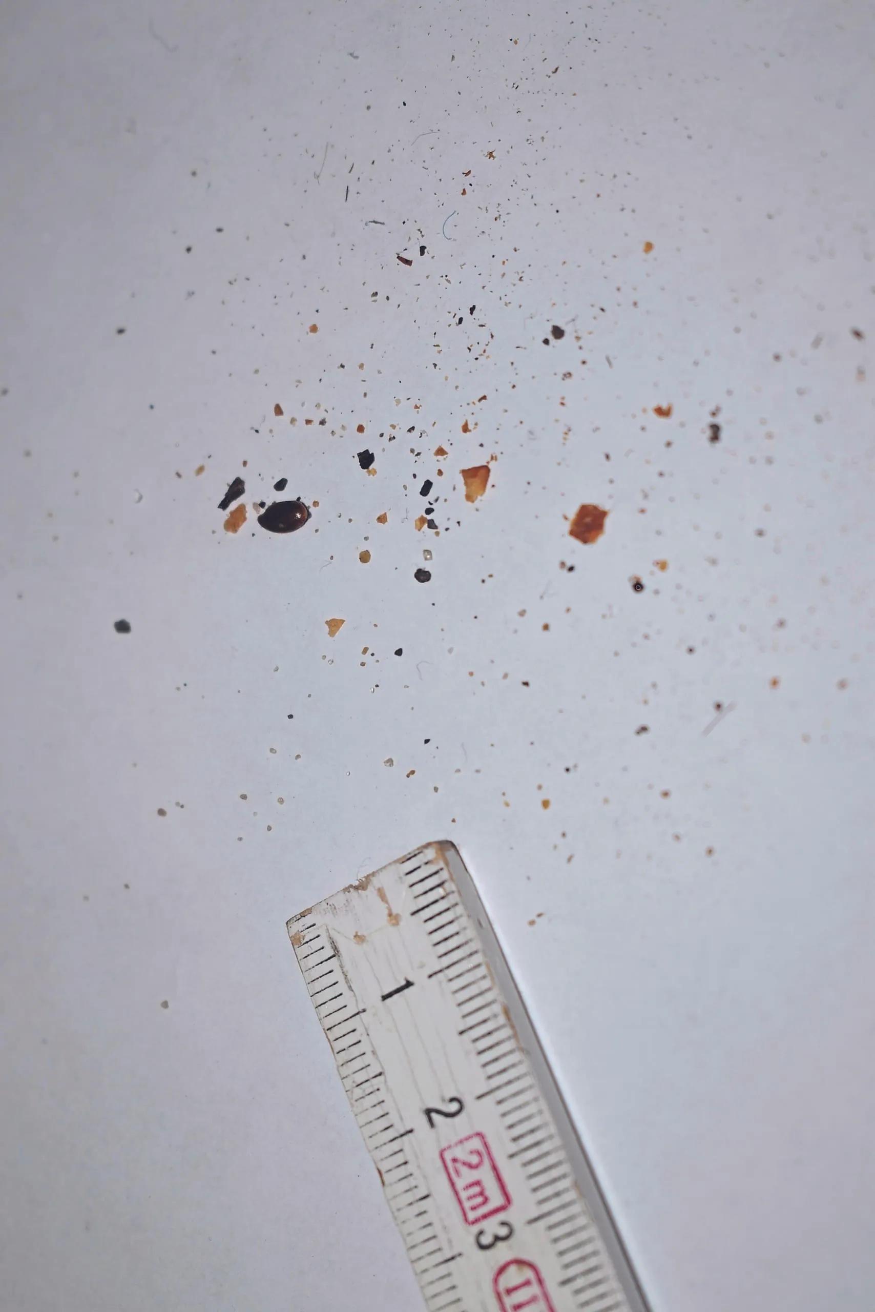Während der vorhergehenden Besprechung im Speisesaal hatte durch das beauftragte Gebäudereinigungsfachunternehmen eine (laufende) Unterhaltsreinigung stattgefunden. Dabei wurde mit dem 2-Eimer-Wischverfahren gearbeitet und ein Produkt als Holz- und Laminatreiniger dem Wischwasser beigegeben sowie mittels einem vorgenässten Mopp nebelfeucht gewischt. Ein Aufstellen der Stühle auf die Tische erfolgte dabei nicht, vielmehr wurde um die Stuhlbeine herum gereinigt. Im Anschluss wurde der gereinigte, lackierte Parkettboden direkt an der Oberfläche überprüft. Es zeigte sich ein relativer Glanzgradunterschied einhergehend mit Kratz- und Schleifspuren, z.B. vor der Buffetausgabe und am Übergang zur Küche, aber lokal und partiell auch im Bereich der Laufzonen. Schließlich wurde unterhalb der Tische im Einflussbereich der Stuhlbeine bei direkter Betrachtung der lackierten Parkettoberfläche festgestellt, dass hier noch Kontaktschmutzansammlungen durch spitzkörnige Sande bzw. Quarzkörner vorliegen (vgl. Bilder 4, 5, 6).