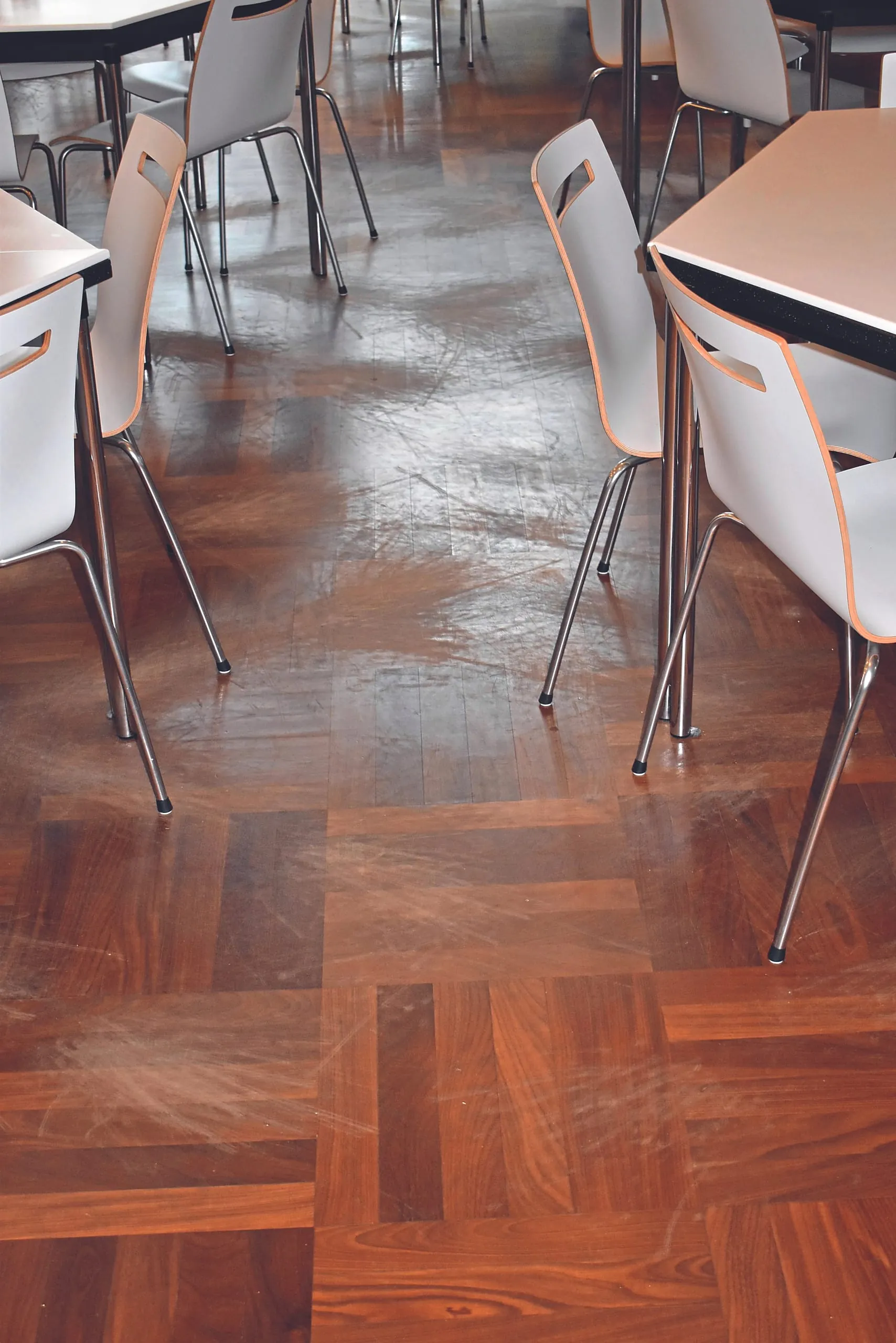 Kratz- und Schleifspuren im Parkettboden sind ein häufiger Reklamationsgrund. Bodenleger verweisen in diesem Zusammenhang unter anderem auf falsche Stuhl- und Tischbeine oder mangelnde Unterhaltsreinigung. Nicht zu Unrecht, wie das Beispiel aus einer Kantine zeigt.