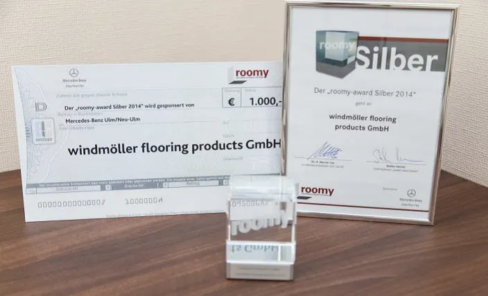 Für seinen dauerelastischen Bioboden Purline erhielt die Windmöller Flooring Products GmbH die begehrte Branchenauszeichnung roomy Award 2014 in Silber .Die damit verbundene Dotierung von 1.000,00 Euro spendete Windmöller jetzt an den Zentralverband Parkett und Fußbodentechnik für Projekte, die den Nachwuchs des bodenlegenden Handwerks fördern.