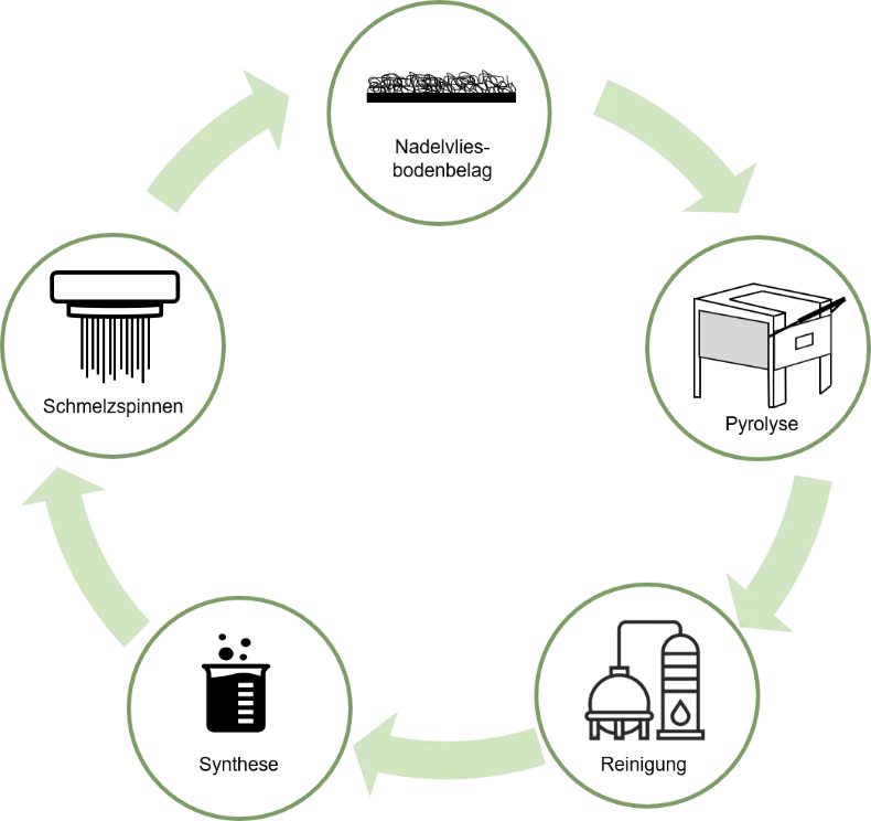 Die überarbeitete Abfallrahmenrichtlinie ((EU) 2018/851) schreibt vor, dass bis zum 1. Januar 2025 separate Sammelsysteme für Textilabfälle in den Mitgliedstaaten einzurichten sind. Bislang werden entsorgte textile Bodenbeläge in der Regel verbrannt, was zu zusätzlichen CO2-Emissionen führt und die Materialien dem Kreislauf entzieht. Vor diesem Hintergrund startet das Institut für Textiltechnik der RWTH Aachen (ITA) ein Projekt zum thermochemischen Recycling von Chemiefasern in Bezug auf die stoffliche Wiederverwertung von textilen Bodenbelägen. Das Projekt zielt darauf ab, polymerhaltige textile Bodenbeläge pyrolytisch zu depolymerisieren. Anschließend werden die Pyrolyseöle gereinigt und die gewonnenen Monomere erneut zu Polymeren (Synthesefasern) bzw. textilen Bodenbelägen verarbeitet. Partner des Projektes ist der Nadelvlieshersteller Findeisen, der die auf dem Weg des Recyclingprozesses hergestellten Stapelfasern wieder zu einem Nadelvliesbodenbelag weiterverarbeitet.