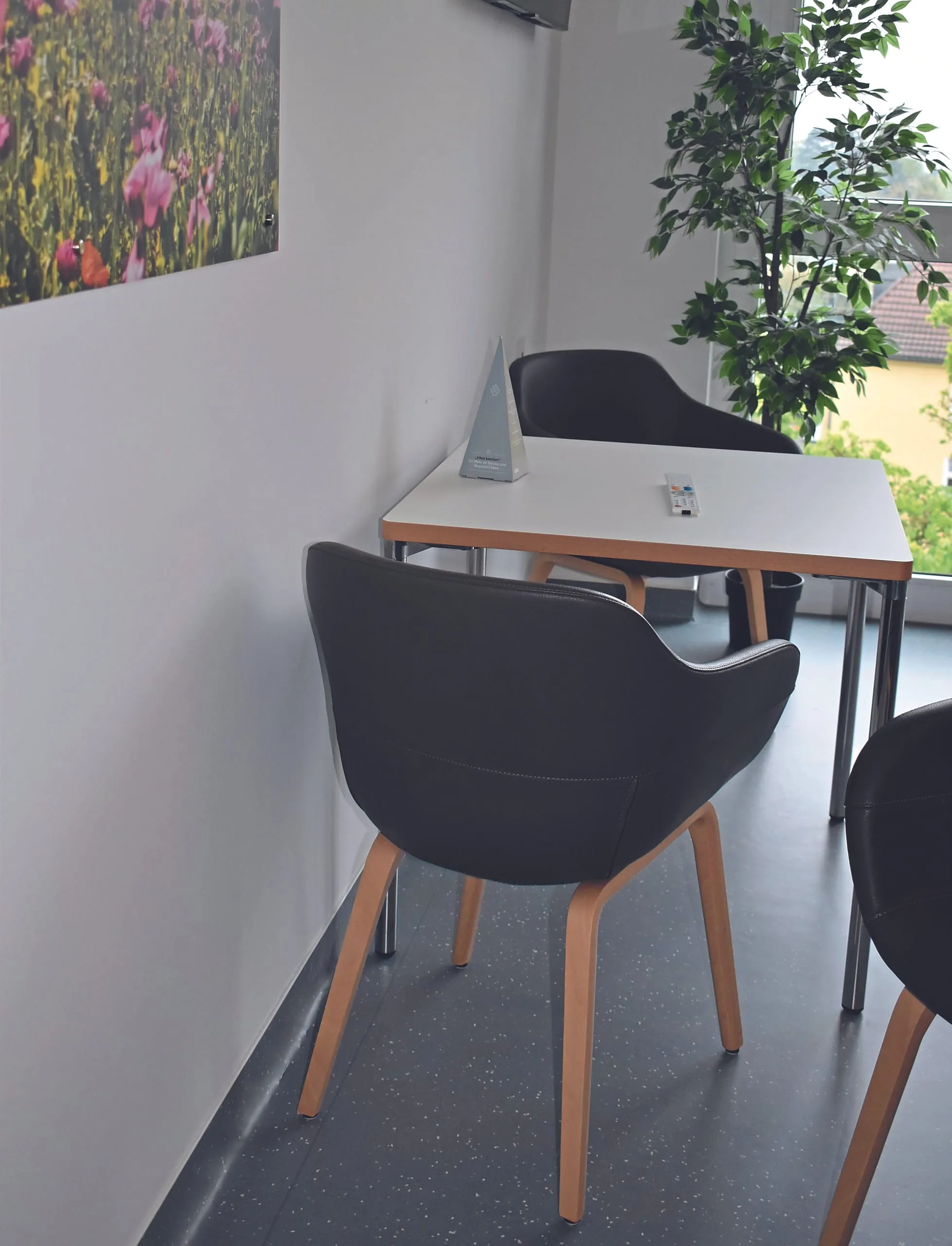 Blick in die Patientenzimmer: Tische und Stühle dicht an den Wänden.