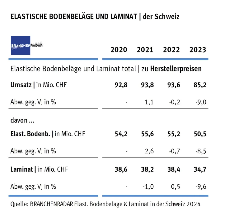 Laut einer Marktstudie des Marktforschungsinstituts Branchenradar.com Marktanalyse gab es nur bei heterogenen Bodenbelägen ein leichtes Umsatzplus. „Ein leicht rückläufiger Neubau und ein auffällig schwächelndes Renovierungsgeschäft stellten die Hersteller von Bodenbelägen im Vorjahr vor gewaltige Herausforderungen“, heißt es dazu in einer Pressemitteilung. Laut dem aktuellem Branchenradar elastische Bodenbeläge und Laminat in der Schweiz sanken 2023 die Herstellererlöse um 9,0 Prozent gegenüber dem Vorjahr auf insgesamt 85,2 Millionen Schweizer Franken (rund 86,2 Millionen Euro). Im Jahresabstand verkürzte sich der Umsatz mit Laminat um 9,6 Prozent und mit elastischen Bodenbelägen um 8,5 Prozent. In beiden Warengruppen war der Umsatzrückgang zu neunzig Prozent und mehr in der Renovierung zu verorten.