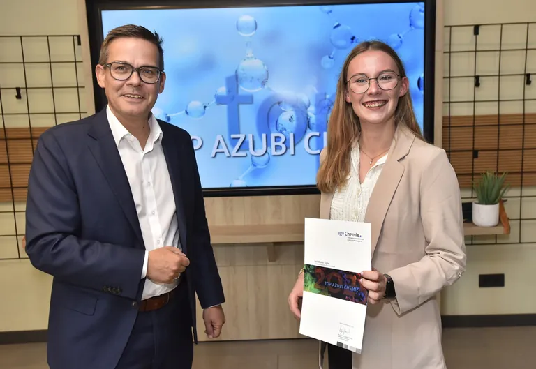 Lea-Marie Sigle nahm die Auszeichnung „Top Azubi Chemie 2025“ von Björn Sucher, Hauptgeschäftsführer des Arbeitgeberverbands Chemie Baden-Württemberg, entgegen. - © aktiv/Roland Sigwart