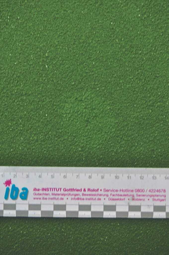 vor. Vereinzelt war an Fehlstellen der gesamte Sportboden in einem Durchmesser von ca. 30 mm abgetragen worden. D.h. die Fehlstelle reichte bis auf den Untergrund. Dabei zeigte eine makroskopische und mikroskopische Inspektion, dass hier eine Art von Gittergewebe sichtbar wird.