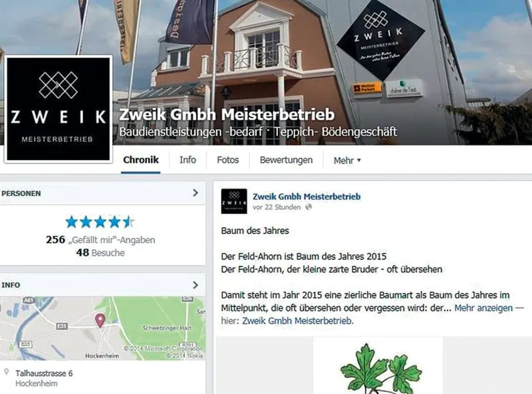 2011 gründete Klewe gemeinsam mit seinem Geschäftspartner, Parkettlegermeister Eddy Keilbach, die Zweik GmbH in Hockenheim. Seitdem ist der Betrieb auch im Internet präsent − und das gleich mehrfach. Die eigene Website, Facebook, Google Plus und ein YouTube-Kanal gehören bei Zweik genauso zum Tagesgeschäft wie die Beratung im Geschäft oder die Verlegearbeit beim Kunden. „Wir sind ein kleines Handwerksunternehmen. Es ist schwer, in Print oder Hörfunk auf uns aufmerksam zu machen. Facebook ist eine schnelle und kostenlose Alternative“, sagt Klewe. Etwa eine Stunde am Tag wendet der 50-Jährige für Facebook auf −getreu seinem Motto „Learning by Doing“. Die Website wurde von einem Designer entworfen. Entstanden ist eine Corporate Identity, die sich vom Logo bis hin zur Typografie auf allen Dokumenten durchzieht. Doch genau an dieser Stelle stößt Klewe bei Facebook an seine Grenzen. Weder die für Zweik typische Schriftart noch das Markenzeichen, die außergewöhnlichen Öffnungszeiten, lassen sich innerhalb der starren Maske Facebooks umsetzen.