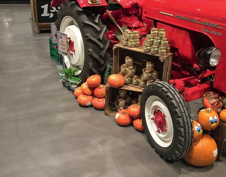 Der Umbau des jüngsten Flaggschiffs des Traditionsunternehmens hat nur knapp sechs Monate gedauert. Eine stilgebende und ebenso funktionale Aufgabe hat dabei der Boden eingenommen. Dieser unterstützt das gesamte Ladenbaudesign, ohne aufdringlich zu wirken und von der eigentlichen Warenpräsentation abzulenken. Das Besondere: Es ist kein Bodenbelag in klassischem Sinne, sondern eine Sicht-Bodenspachtelmasse, die Mapei unter anderem speziell für den Einsatz in gewerblichen Objekten wie Supermärkten und Einkaufszentren sowie für den Industriebereich entwickelt hat. Das Produkt namens „Ultratop“ garantiert laut Hersteller flache Oberflächen ähnlich wie Betonböden, die sich werksseitig eingefärbt bestens für die dekorative Bodengestaltung im Objekt eignen. Im neuen Rewe-Markt entschieden sich die Verantwortlichen für einen Anthrazitton, der farblich sehr gut mit den anderen Ladenbauelementen harmoniert. „Der Markt hat einen großen Durchlauf an Branchen-Besuchern aus dem In- und Ausland. Es gibt viele Fragen zum Boden und dessen Gebrauch“, sagt Lutz Richrath, der mit der Wahl des Bodens durchaus zufrieden ist.
