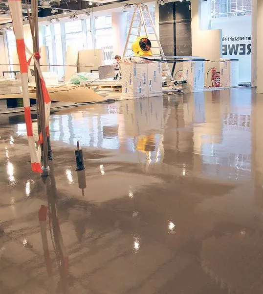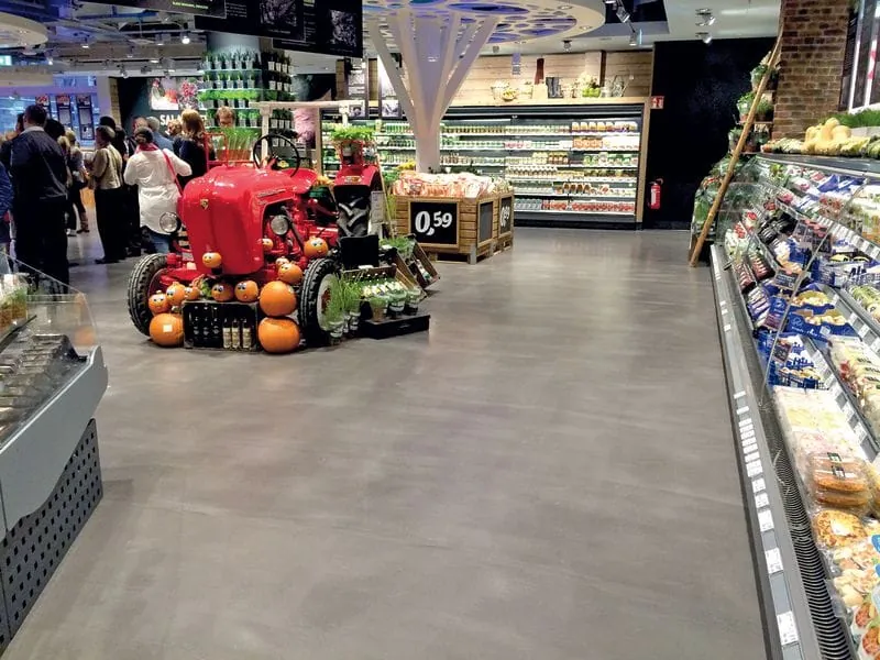 Die Anforderungen an den Boden in diesem Objekt sind sehr hoch: Die enorme Kundenfrequentierung, deren stete Nutzung von Einkaufswägen und die Belastung durch Handhubwägen zum Auffüllen der Ware verlangen ihm einiges ab. Trotzdem muss dauerhaft ein homogenes und rissfreies Oberflächenbild des Bodens garantiert sein – Grundlage hierfür sind die Vorarbeiten: Vor Einbau der Bodenspachtelmasse bereiteten die Verarbeiter den Untergrund mit der Mapei-Grundierung „Primer SN“ fachgerecht vor, sodass „Ultratop“ zügig und maschinell mittels Pumpe eingebaut werden konnte. Als Ergebnis ist der Boden beständig gegen Abrieb, ohne weitere Beschichtungen aufbringen zu müssen. Der „Ultratop“-Boden ermöglicht Schichtdicken zwischen fünf und 40 Millimetern.