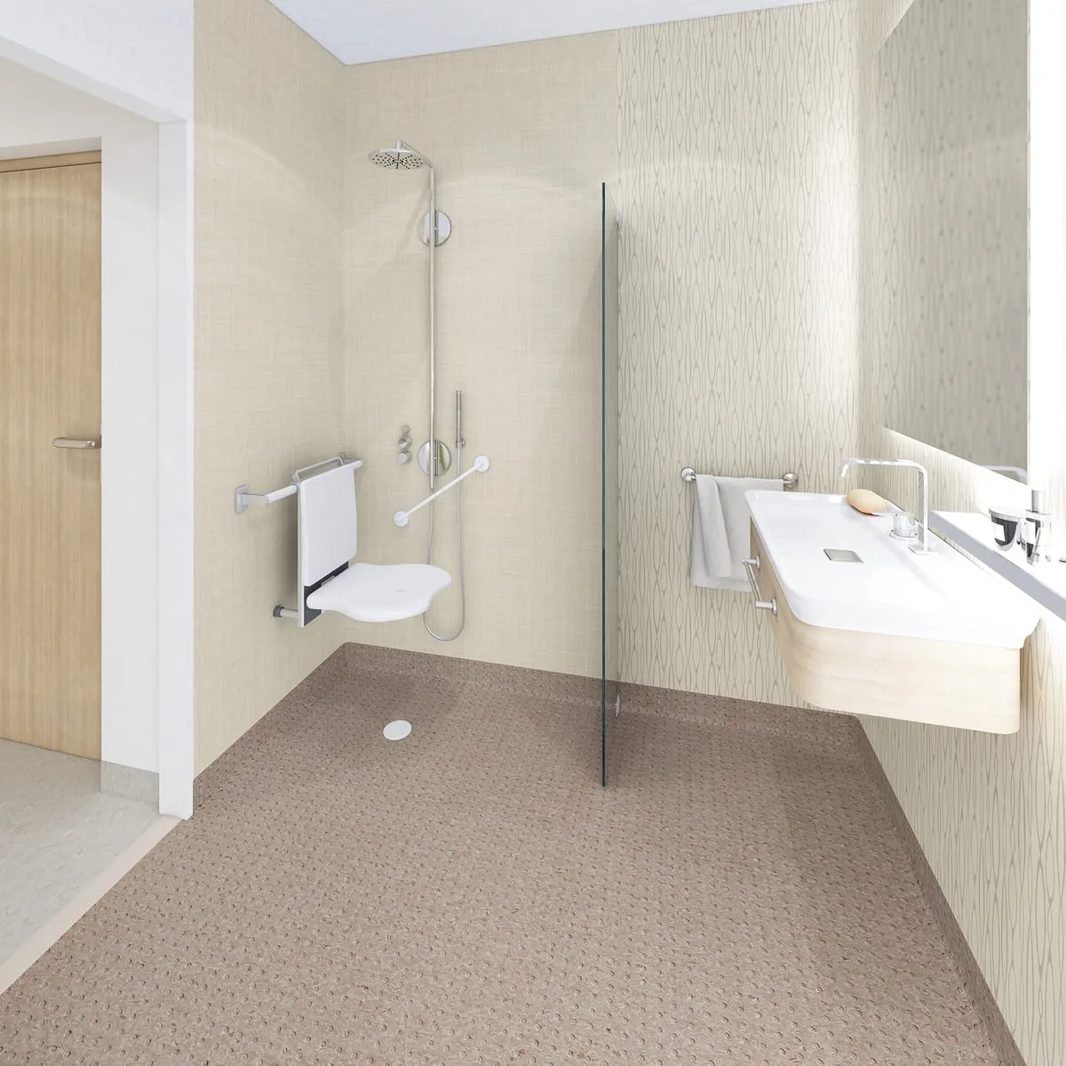 Gesättigte, warme Farben wirken beispielsweise beruhigend und familiär. Auf abstrakte Muster und grelle, blendende Farbtöne sollte stattdessen verzichtet werden, um die Orientierung zu erleichtern und Stürzen vorzubeugen. Böden mit Schalldämmung verbessern zudem die Akustik, da sie Hintergrundgeräusche minimieren und ein ruhiges Umfeld fördern, in dem Kommunikation stattfinden kann.