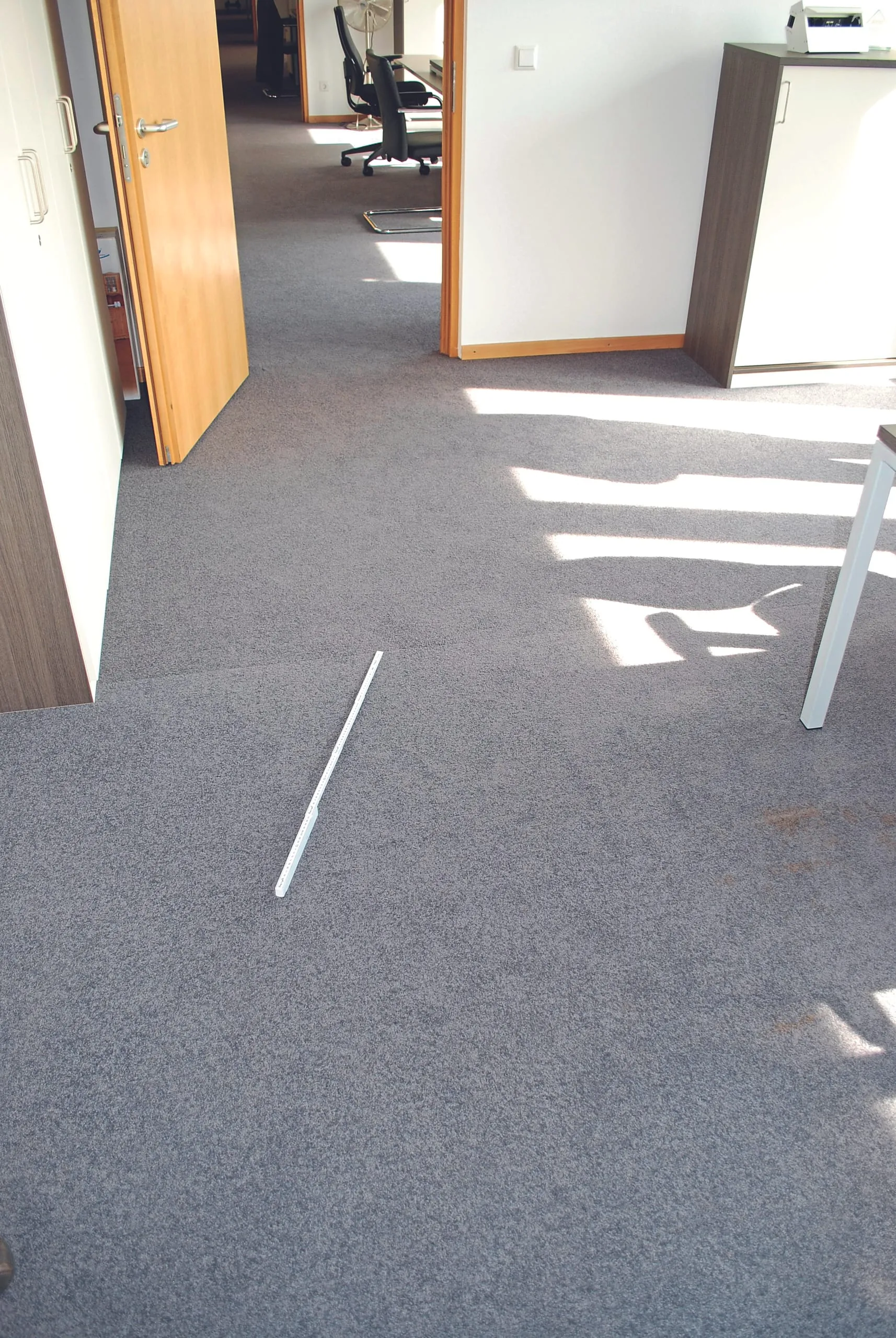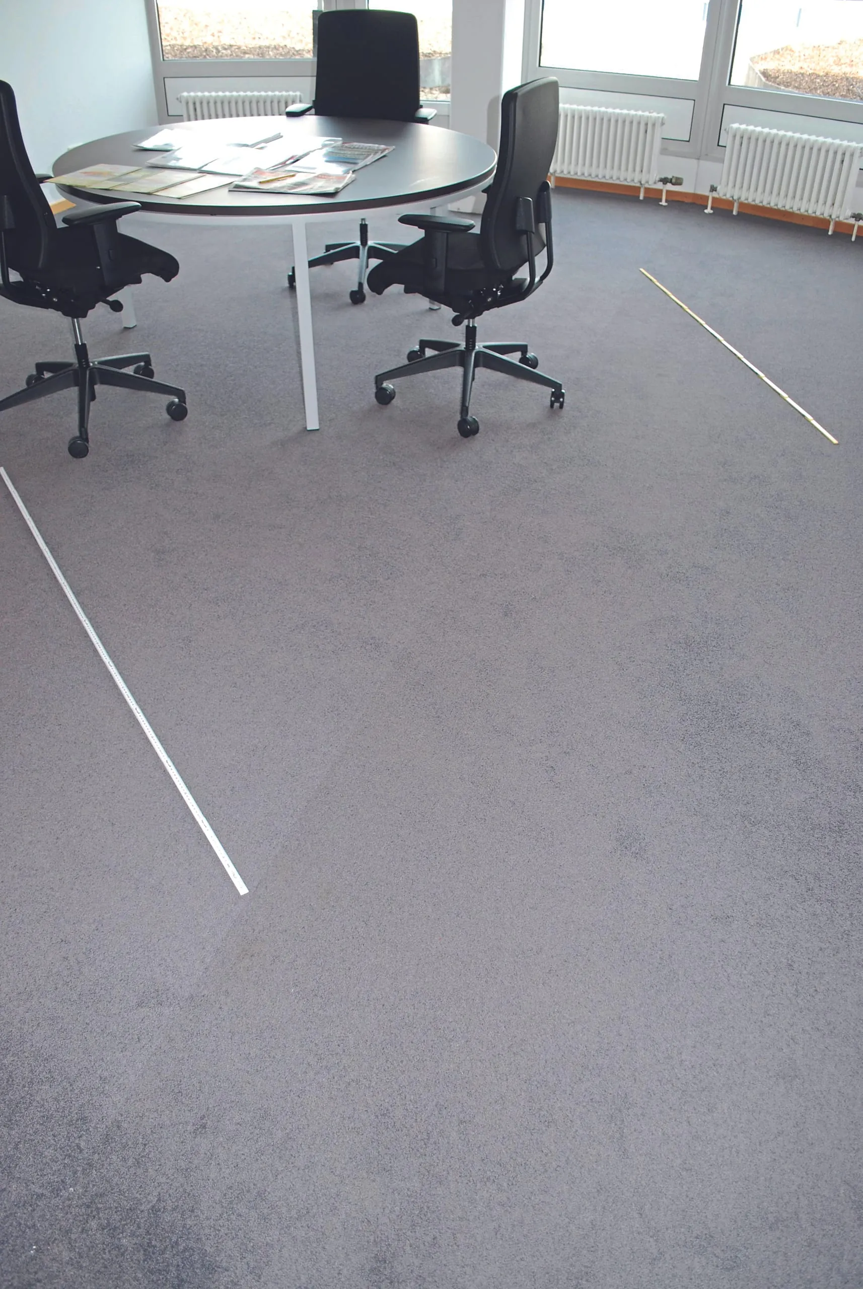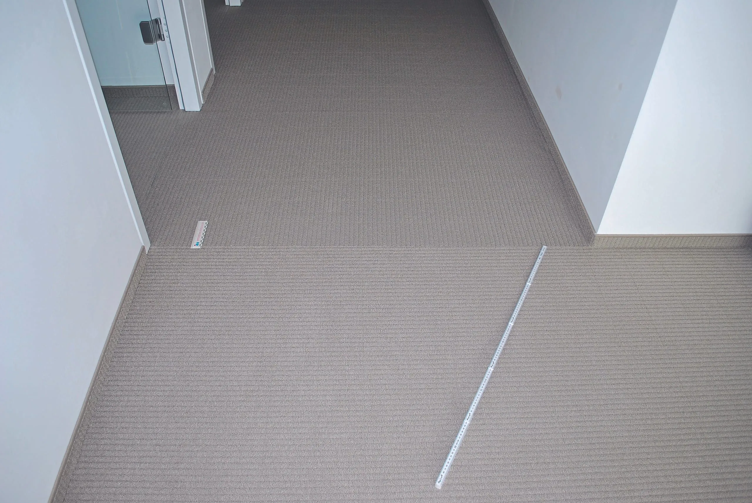 In einem neu errichteten Bürogebäude wurde ein hellgrauer textiler Bodenbelag (Schlingenware, getuftet) mit synthetischem Rücken verlegt und am Untergrund verklebt. Zur Abnahme reklamierte der Auftraggeber ein unterschiedliches Erscheinungsbild mit Musterversatz und Farbunterschieden. Der Hersteller und Auftragnehmer für Bodenbelagarbeiten konnten keinen Fehler erkennen und die Mängel wurden zurückgewiesen. Zur Klärung des Sachverhalts wurde daher vom Auftraggeber ein Sachverständiger des iba-Instituts beauftragt, den Istzustand zu ermitteln.