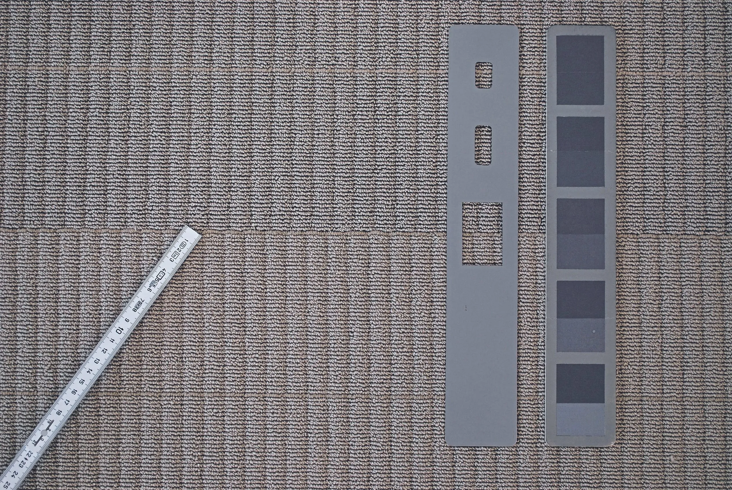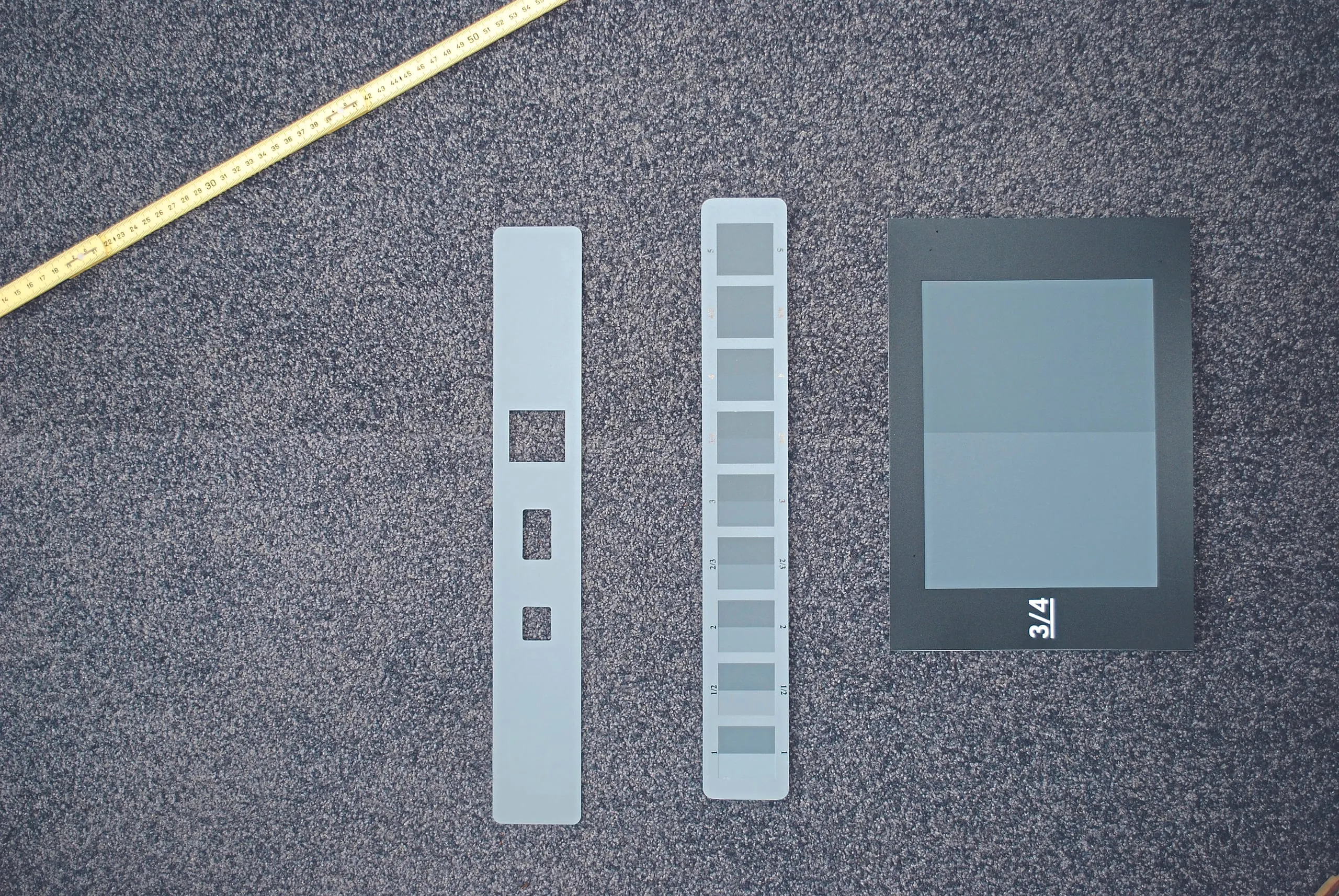 Zur besseren Handhabung bzw. Abgrenzung des Beurteilungsfeldes ist ein Rahmen in der gleichen Größe wie der Graumaßstab vorhanden. Für die Bewertung von Farbtonabweichungen bei Bodenbelägen wird der Graumaßstab mit zwei Stufen so auf den Boden gelegt, dass der dunklere Teil des Graumaßstabs auf dem dunkler erscheinenden Bodenbelag aufliegt. Dabei wird der Graumaßstab mit dem Verhältnis im Standardgrau zum benachbarten (helleren) Grau gesucht, welcher dem vorhandenen Farbtonunterschied oder einer vorhandenen Farbtonabweichung zwischen den bahnenförmigen Bodenbelägen am besten entspricht.