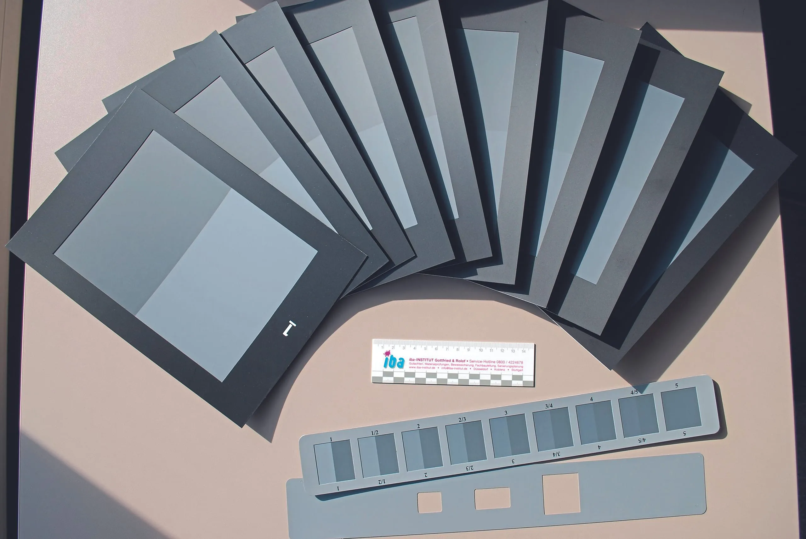 - In 19 Räumen und 2 Fluren bei 42 Prüfstellen eine Abweichung nach Graumaßstab der Stufe 5,