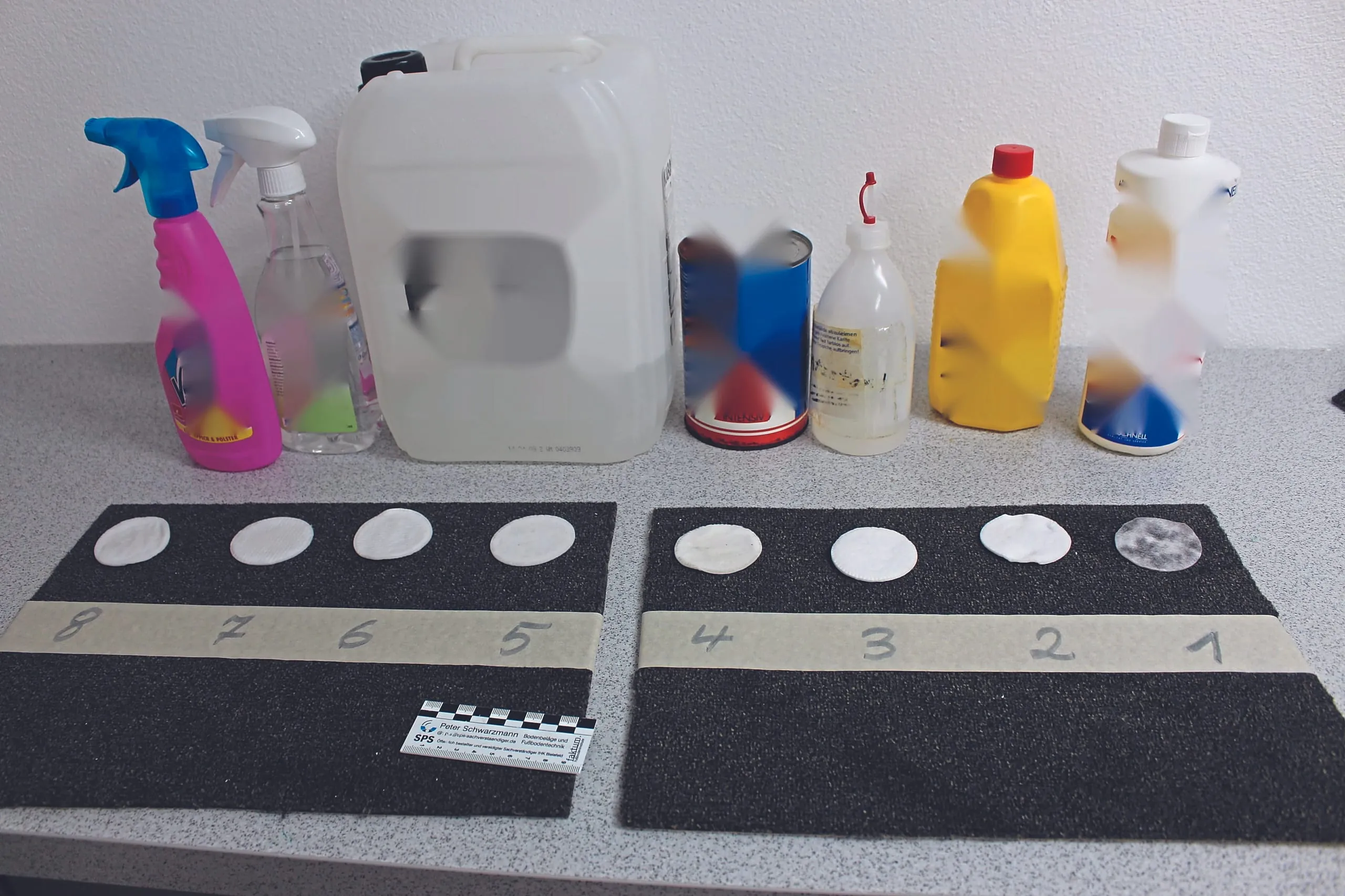 Die Testreihe, bei der die vor Ort verwendeten Reinigungsmittel als auch unverlegte Reste des verklebten Teppichbodens verwendet werden konnten, sollte weitere Erkenntnisse ergeben. Der Teppichboden wurde mit Klebeband abgeklebt und nummeriert, um die jeweiligen Teststellen zu einem späteren Zeitpunkt noch zuordnen zu können. Auf einer Teppichbodenprobe sind die Reinigungsmittel unverdünnt aufgebracht worden. Auf einer weiteren Teppichbodenprobe wurden die Produkte in der angegebenen Höchstdosierung aufgebracht.