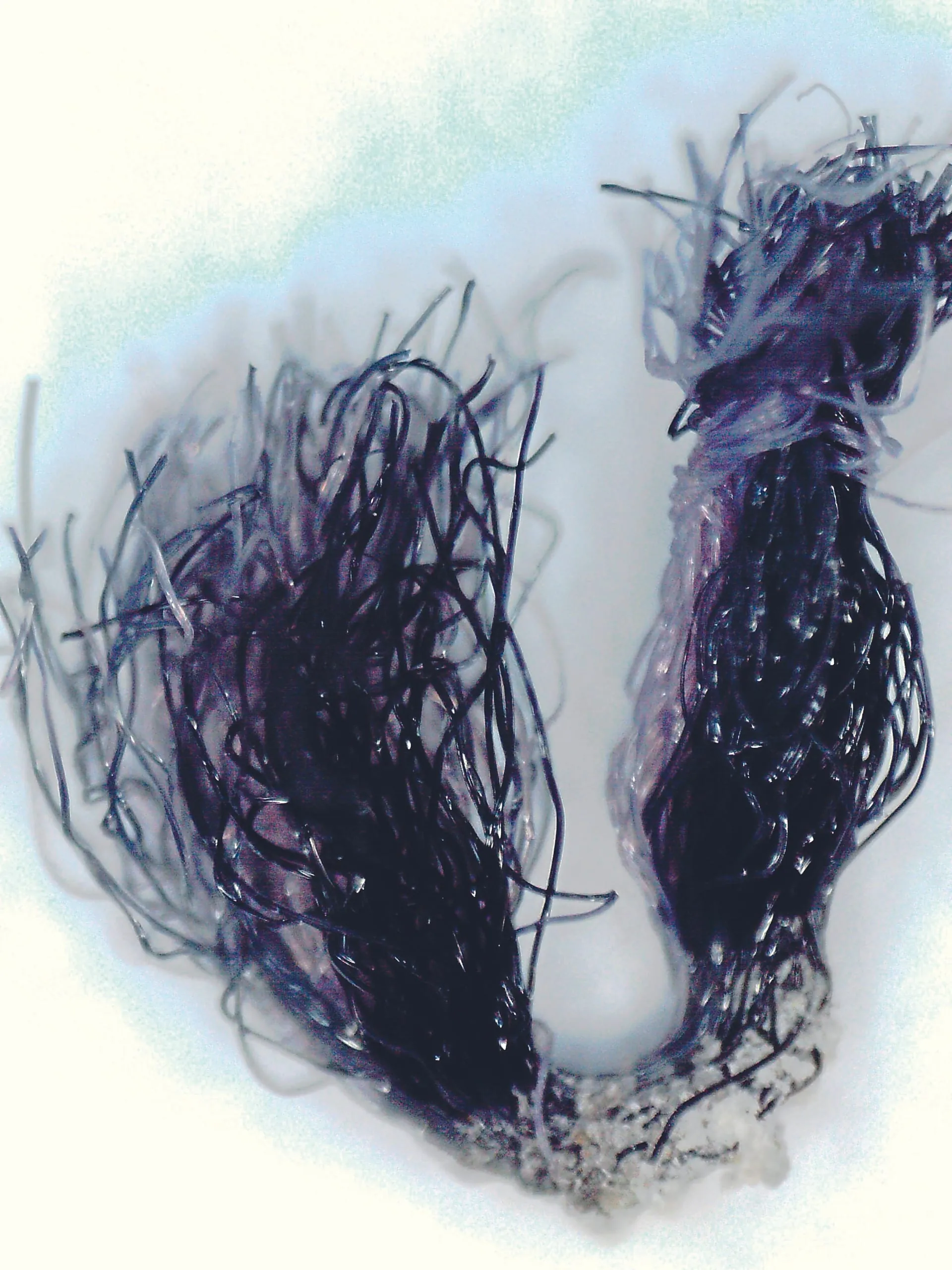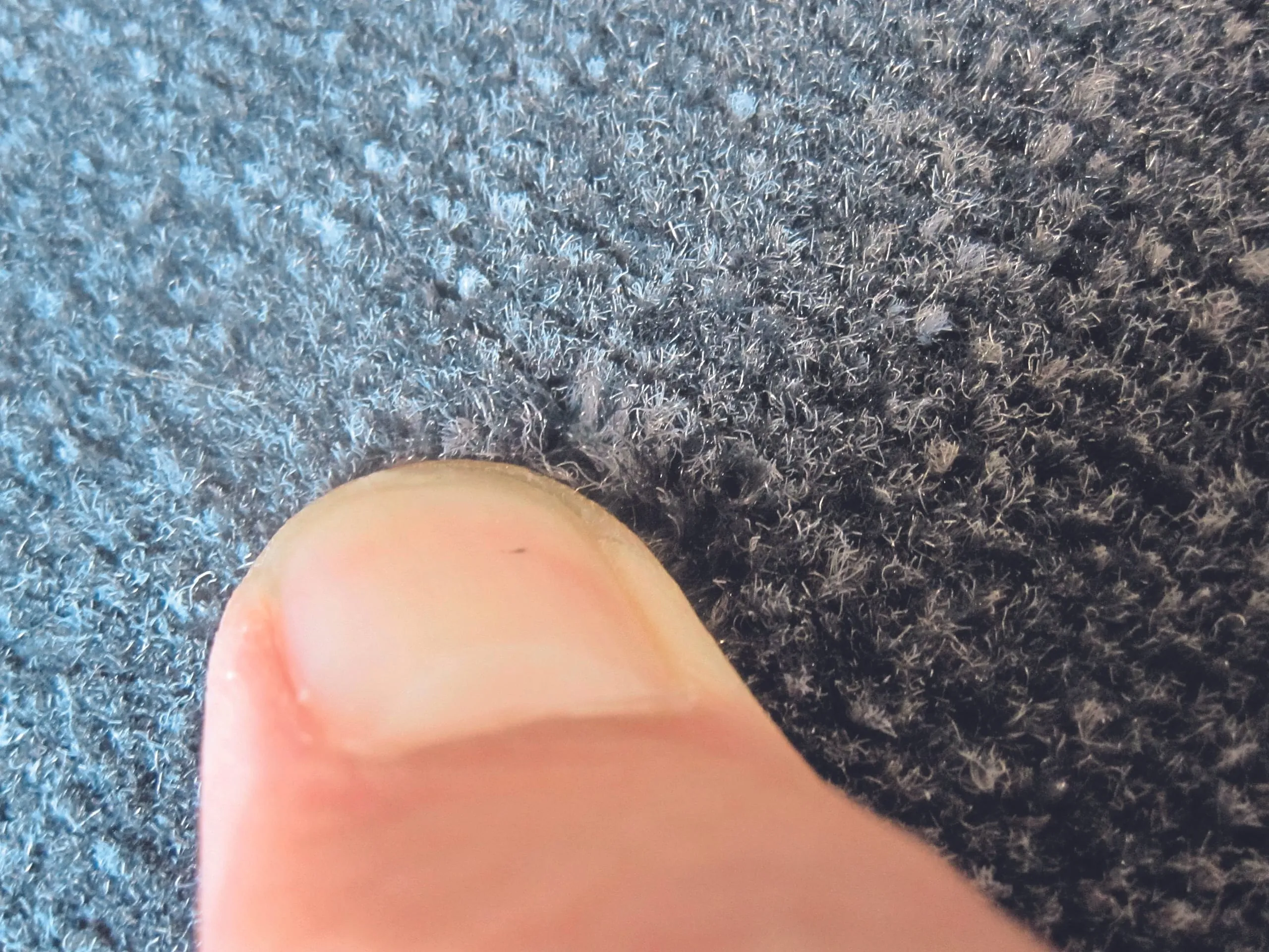 Um zu erkennen, weshalb der anthrazitfarbene Teppichboden nun an den betroffenen Stellen blau wirkt, wurde eine Polnoppe entnommen. Bei der optischen Überprüfung konnte man erkennen, dass ein Teil der Faserfilamente tatsächlich blau ist. Es fand demzufolge ein Farbumschlag statt. Offensichtlich besteht das Garn aus zwei unterschiedlichen Farben, was bei der Detailbetrachtung deutlich zu erkennen ist. Der Vergleich mit der entnommenen Polnoppe zeigte auf, dass die Faserfilamente mit der hellgrauen Farbe nun blau sind. Die schwarzen Faserfilamente sind unverändert geblieben. Die Farbveränderung reichte bis zum Grund der Polnoppe, was wiederum aufzeigt, dass die farbverändernde Flüssigkeit den Teppichboden nicht nur oberflächlich benetzte, sondern bis zum Grund des Teppichbodens gelaufen sein muss (siehe Abbildungen zum Farbumschlag).