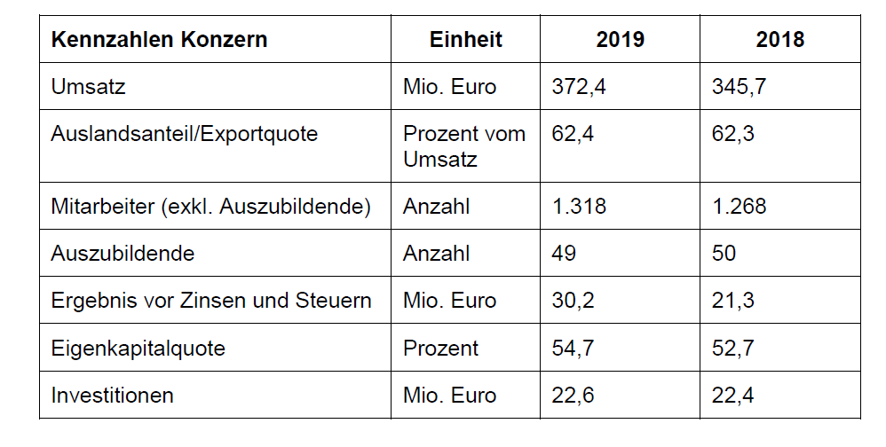 Der Konzernumsatz konnte um 7,7 % auf 372,4 Mio. Euro (2018: 345,7 Mio. Euro) gesteigert werden. Mit 30,2 Mio. Euro lag das Ergebnis vor Zinsen und Steuern im Konzern deutlich über dem Vorjahr (2018: 21,3 Mio. Euro) und belegt damit die höchsten Ergebniswerte in der Unternehmensgeschichte.