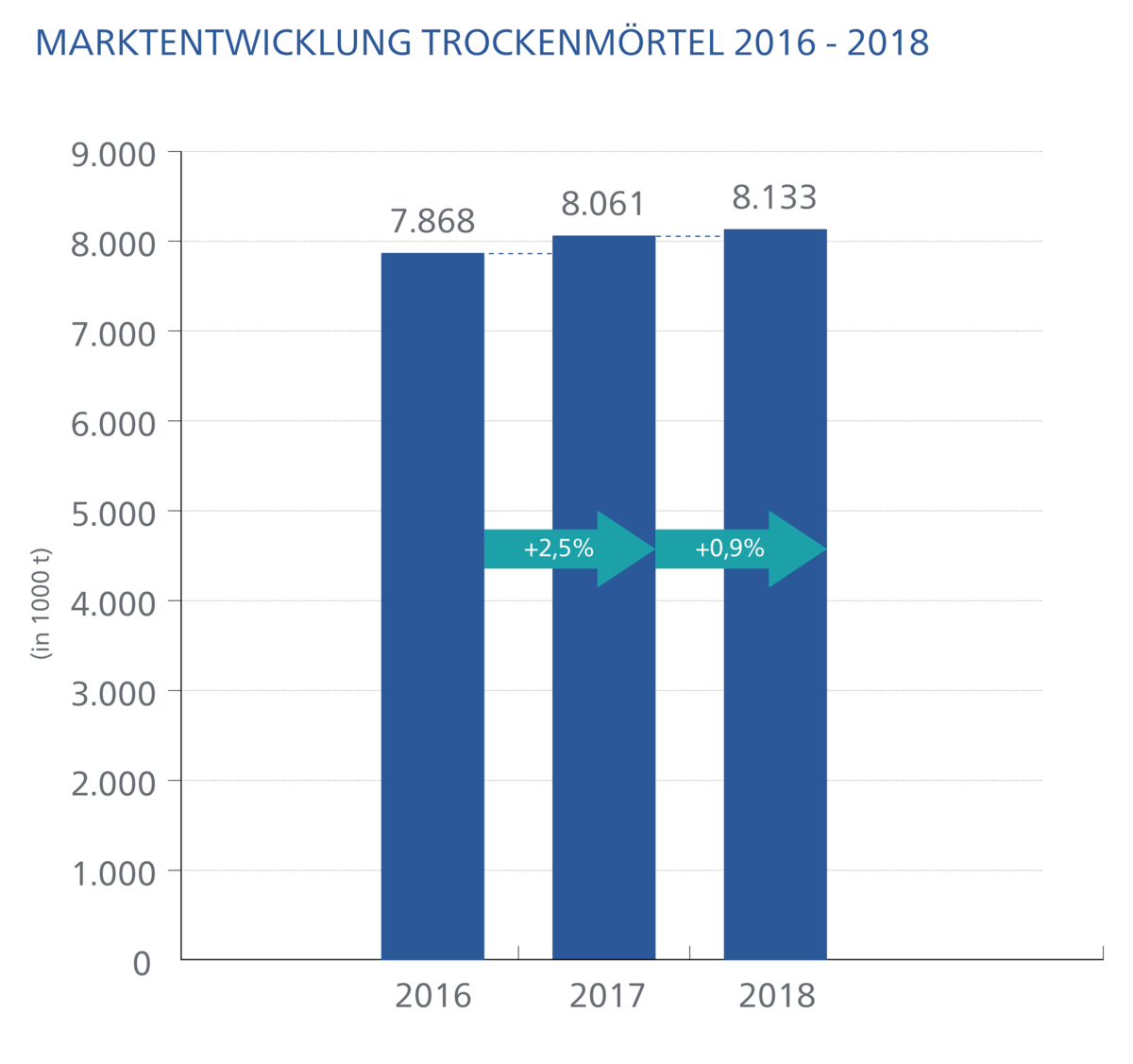 Estrichmörtel haben sich im Jahr 2018 deutlich besser entwickelt als die anderen Produktsegmente (Mauermörtel, Fliesenmörtel, Trockenbeton/Spritzbeton, Mörtel für Garten und Landschaftsbau). Der Absatz von Estrichmörtel konnte ein Plus von +2,8 % zum Vorjahr verzeichnen. Bereits im Jahr 2017 entwickelten sich die Estrichprodukte positiver als der Gesamtmarkt, was in erster Linie auf die überdurchschnittliche Nachfrage aus dem Neubau zurückzuführen ist.