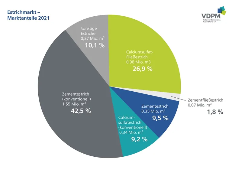 Die Verschiebungen bei den Marktanteilen der einzelnen Estrichtypen sind nach wie vor gering. Leicht zulegen kann konventioneller Baustellen-Zementestrich von 1,53 Mio. m³ auf 1,55 Mio. m³. Damit erhöht sich dessen Marktanteil von 41,4% (2020) auf 42,5%.