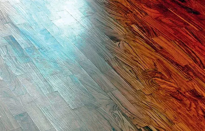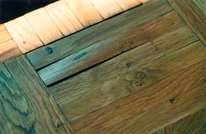 3 Die einzelnen Parkettelemente sind nicht nur kopfseitig dunkel verfärbt, sondern auch konkav verformt, weil beim Reinigen der Fliesen mit viel Feuchtigkeit gearbeitet werden konnte, die im Übergangsbereich vor allem über die Hirnseite in das Parkett eindringen konnte.