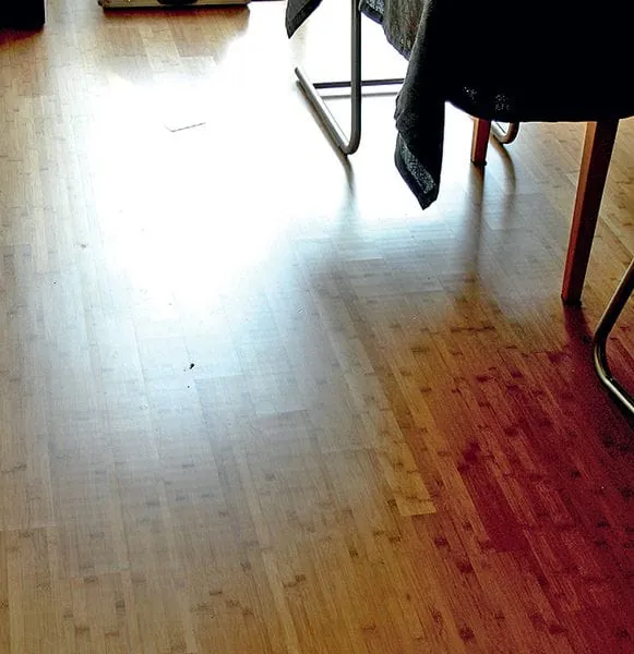6 In diesem Fall handelt es sich um einen Tauwasserschaden. Ein alter Fliesenboden war herausgerissen worden, der Unterboden erhielt einen Ausgleichsestrich und darauf wurde das Bambusparkett verlegt, ohne die Temperaturabhängigkeiten zu beachten.