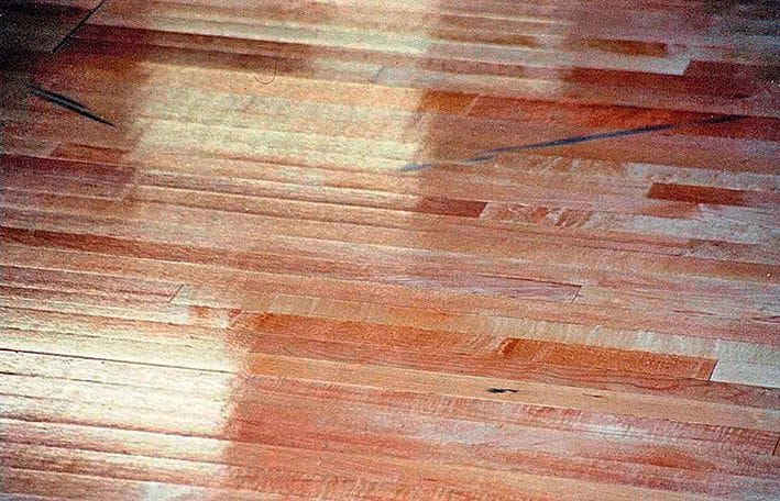 7 In diesem Falle handelt es sich um eine konvexe Verformung eines Stabparkettbodens auf einer Sportbodenkonstruktion. Der kanadische Ahorn war zum Zeitpunkt der Verlegung bis auf ca. 5,5 Prozent heruntergetrocknet als er verlegt wurde, ergab die Sichtung noch folienverpackter Restpakete.