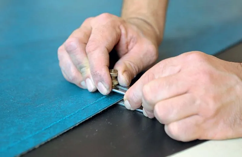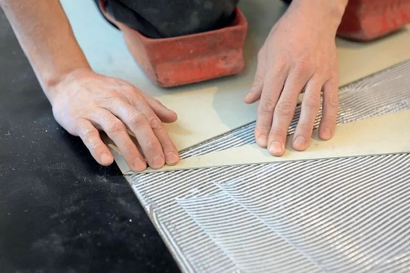 Die Schwierigkeit für das ausführende Unternehmen Zimmermann Fussbodentechnik bestand vor allem darin, die einzelnen geometrischen Formen exakt zuzuschneiden und anzuarbeiten (anzureißen), ohne dass im Nachhinein die Fugen zwischen den einzelnen Linoleumstücken abgedichtet werden mussten. „Gerade das passgenaue Anschneiden des Linoleums stellte für uns eine große Herausforderung dar“, schilderte Mike Zimmermann die Problematik, vor die seine Mannschaft gestellt wurde. „Das galt insbesondere für die zulaufenden Spitzen der innenliegenden Linoleum-Dreiecke am umlaufenden Randfries im Ausstellungsraum des Verbunds.“ Im Flur im Übergang zum Küchenbereich wurde nach Absprache mit dem Bauherrn aus dem verbliebenen Restmaterial eine dreidimensionale Musterverlegung mit umlaufendem Randfries umgesetzt, bei dem jede einzelne Raute des Musters per Hand zugeschnitten wurde.