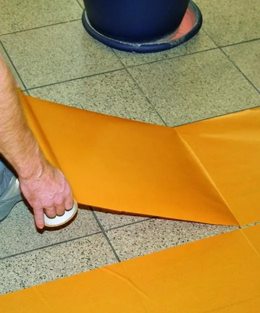 Die Position des Belags wurde auf dem Boden markiert und der Teppich gleich wieder aufgerollt. In der so ausgemessenen Fläche klebten die Bodenspezialisten die DT 100 Quick-Lift-Haftfolie auf. In der Drytack-Palette ist sie das Produkt für Flächenverlegungen, das eine spätere rückstandsfreie Wiederaufnahme erlaubt. Um Lufteinschlüsse zu vermeiden und das Foliensystem rationell zu verarbeiten, schoben die Profis die Trockenkleberrolle mit Besen vor und rieben die abgewickelte Bahn so in einem Arbeitsschritt direkt an den Fliesenuntergrund an.