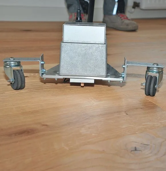 Hess hat damit ein Gerät entwickelt, mit dem man Hohlstellen unter Parkett- und Dielenböden aufspüren kann. Nun gibt es die verschiedensten, sogenannten Hohlstellensuchgeräte, mit denen vor allem Sachverständige über den Boden streifen, um diejenigen Stellen ausfindig zu machen, die für manch einen Kunden Anlass zu Beanstandungen geben. Das ist allerdings nicht der Ansatz des Tüftlers aus dem Rhein-Main-Gebiet. Aufgrund jahrelanger Erfahrung aus der Baustellenpraxis weiß er, worauf es ankommt: „Vorbeugen ist besser als Heilen“, sagt Hess und hat eine Prüfungsvorrichtung entwickelt, mit der er noch vor Fertigstellung des Parkettbodens die Bereiche aufspüren kann, die später eventuell Sorgen bereiten könnten.