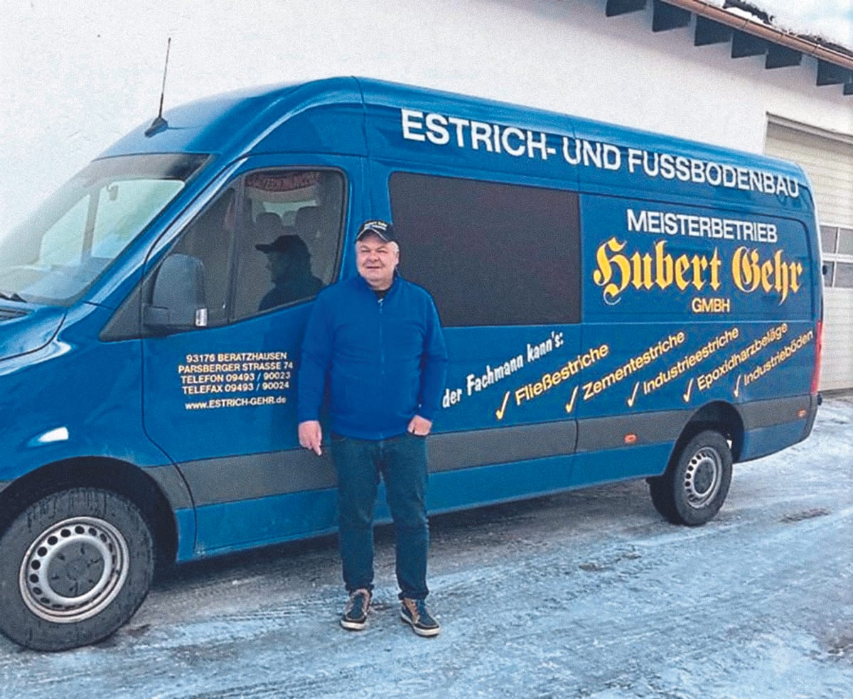 Einer, der so handelt, ist Hubert Gehr (54), Estrichlegermeister aus Beratzhausen im Oberpfälzer Landkreis Regensburg. 1996 hat er den elterlichen Betrieb übernommen und damit auch ein Team, das dem Unternehmen seit langem die Treue hält: „Wir haben einige Mitarbeiter über 50 und zwei, die älter als 60 Jahre sind . Eine Betriebszugehörigkeit von 30 Jahren und mehr ist bei uns die Regel, nicht die Ausnahme.“ Die Hubert Gehr GmbH bietet neben der Estrichverlegung weitere Leistungen im Fußbodenbau und bei Industrieböden an. Im Radius von rund 100 Kilometern reicht die Bandbreite der Bauvorhaben von 10 m² in Einfamilienhäusern bis zu 50.000 m² Fläche in Gewerbe- oder Industriebauten, letztere erstellt das Unternehmen in ganz Bayern.