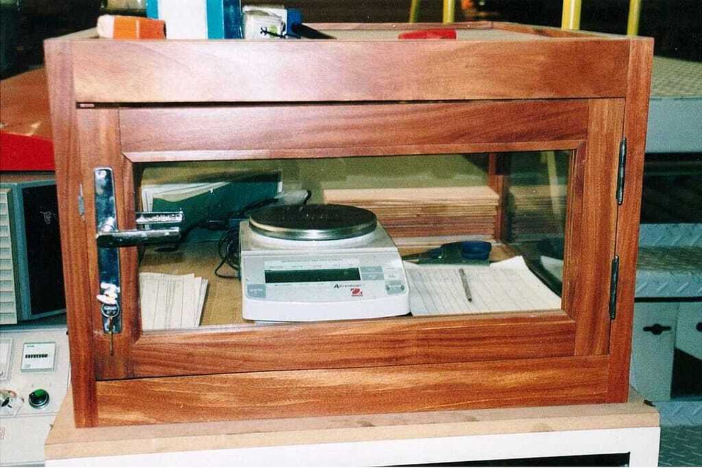 Lackwaagen werden zur Gewichtsbestimmung des aufgetragenen Lackes in der Fertigungsindustrie benutzt. Beim Mehrschichtparkett kommen unterschiedliche Decklacke, Grundlacke, Grundierungen oder Spachtelgründe verschiedenster Fabrikate und Qualitäten zum Einsatz, die nach individuellen Aufbauprinzipien in sogenannten Lackstrassen auf das Holz gebracht werden und in aller Regel mit UV – Licht nach erfolgtem Auftrag getrocknet werden. Um im Rahmen der Qualitätssicherung die Menge das Gewicht der jeweiligen Lackschicht kontrollieren zu können, werden sogenannte Lackwaagen eingesetzt, an denen an mitlaufenden Probestücken die Gewichtsveränderung sehr genau festgestellt werden kann, um dann gegebenenfalls auch korrigierend in den Fertigungsprozess eingreifen zu können.