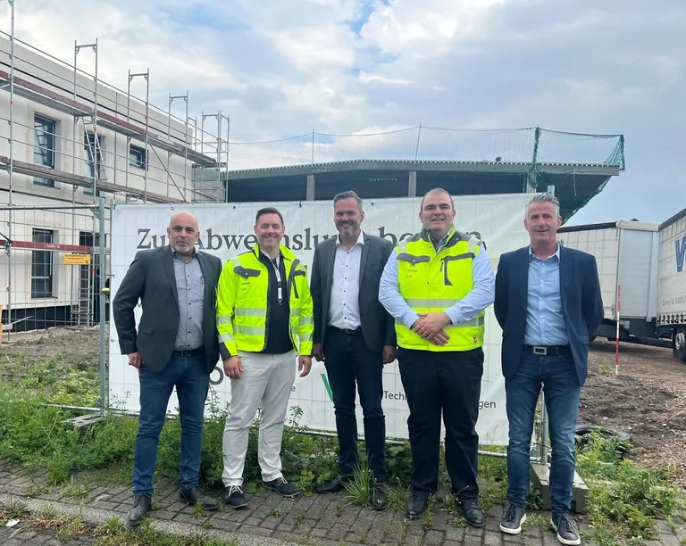 Beim Richtfest von Wego (v.l.): Alexander van Setten (Niederlassungsleiter), Michael Abersfelder (Finanzen), Marc Rohleder (Vertriebsleiter), Alfons Horn (Vors. Geschäftsführung), Uwe Strasser (Vertriebsleiter Vti) - © Wego