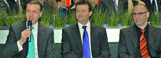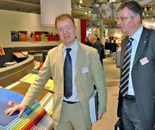 1 IVC gehört zu den absoluten Gewinnern bei CV-Belägen. Momentan liegt das belgische Unternehmen in Deutschland auf dem zweiten Platz. Tendenz steigend. 2 Nadelvliesspezialist Finett präsentierte sich mit einem ansprechenden Messeauftritt in der „Architektenhalle 4“. 3 Schnelle Produkte für Terminbau stellen standen auch bei Mapei im Fokus der Domotex-Präsentation. Mit dabei: Dr. Marco Squinzi, Sohn von Giorgio Squinzi, im Bild rechts neben dem tech nischen Produktmanager Günther Hermann . 4 „Deutschland hat 2007 leider nicht zum Umsatzplus beigetragen“, berichtet Balta Vertriebsleiter Ludo Vandenabeele. Mit einem einstelligen Minus im Handelsgeschäft und starken Zuwächsen im Objektbereich liegt Balta hierzulande aber deutlich über dem Durchschnitt. Insgesamt konnte Balta binnen zwei Jahren intern um 20 Prozent wachsen. 5 Beat Ludin leitet ab sofort den Vertrieb von Uzin in Deutschland. 6 „Wir wollen auch auf dem deutschen Markt rasch vorwärtsschreiten“, verspricht Best-Wool-Carpets-Chef Yvar Monasch (rechts neben Verkaufs- und Marketingdirektor Olivier Overweg). Wer genau hinsah, konnte am Stand des Schurwollspezialisten eine der selten gewordenen Teppichbodeninnovationen sehen: einen getufteten Wollteppich in Strickoptik. 7 Guy Hoste (Vertrieb Deutschland) und Yves Bonne (Vertrieb International) wollen in Deutschland Marktanteile für Teppichböden der Beaulieu Interna tional Group gewinnen. Auf der Do mo tex zeigte Beaulieu ein breit gefä chertes Sortiment an textilen Bodenbelägen. 8 „Wir sind bei CV inzwischen die Nummer drei in Deutschland“, sagt Beau floor-Geschäftsführer Peter Roos (rechts neben Rettberg-Geschäftsführer Dieter Lesage). Beim Holzdesign geht der Trend weg vom Schiffsboden hin zur Planke mit Abmessungen bis 150 Zentimeter. 9 Am Stand von Wools of New Zealand präsentierte Ron Zandwijk von der niederländischen Firma Printos Teppichentwicklern einen Druckkopf zum digitalen Bedrucken von Teppichböden, der die bisherigen Möglichkeiten von Chromojetanlagen hinsichtlich Auflösung und Präzision in den Schatten stellen könnte. 10 Nordpfeil nutze die Domotex, um neben der Kollektion Compact Express die neue Hotelkollektion Variations vorzustellen. 11 Zwei, die gut miteinander können: Debolon-Geschäftsführer Andreas Kopf (links) und Objectfloor-Chef Eberhard Lotz. 12 Präsenz in Sachen „Sauberlauf“: CRO-Geschäftsführer Horst Reimer (rechts) und EMCO-Vertriebsleiter Jörg Harbecke. 13 Mit dem Erwerb der RZ Chemie baut Uzin seine Kompetenz an der Boden oberfläche aus. Das Wachstum der Uzin-Utz-Gruppe betrug 2007 knapp acht Prozent. „Für 2008 sollte ein Mengenwachstum zwischen zwei und drei Prozent möglich sein.“ Dafür wollen (v.l.n.r.) Vorstand Thomas Müllerschön, Ge samtvertriebsleiter Stefan Neuberger und Heinz Leibundgut, Gesamtexport leiter Westeuropa der Uzin Utz AG, sorgen.
