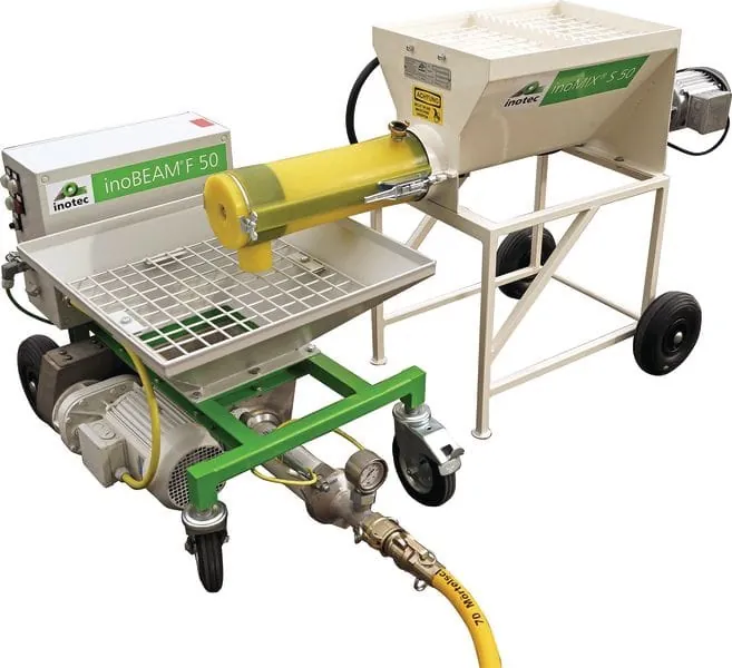 Mit moderner Maschinentechnik lässt sich die Verarbeitungszeit von Spachtelmassen nämlich in jedem Fall deutlich verkürzen: Schon mit kleinen 230-Volt-Mischpumpenkönnen bis zu 25 l pro Minute an Spachtelmasse angemischtund gepumpt werden – das sind rund 2 t in der Stunde. Die Maschinentechnik wird dazu meist außerhalb der Baustelle am Mischplatz aufgebaut ; die Spachtelmasse wird direkt daneben platziert, sodass der Transport der Säcke schon mal gänzlich entfällt.