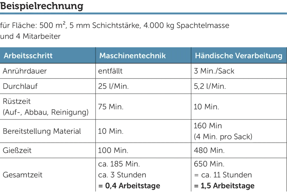 Um also die gesamte Fläche von 500 m² zu spachteln, bräuchte man so mit Hilfe der Mischpumpe lediglich knapp 2 Stunden . Der Auf-und Abbau der Maschine sowie die abschließende Reinigung der Maschine kann mit ca. 1 Stunde berechnet werden. Somit werden insgesamt rund 3 Stunden Zeitaufwand benötigt gegen über ca. 11 Stunden bei händischer Verarbeitung (siehe Tabelle).
